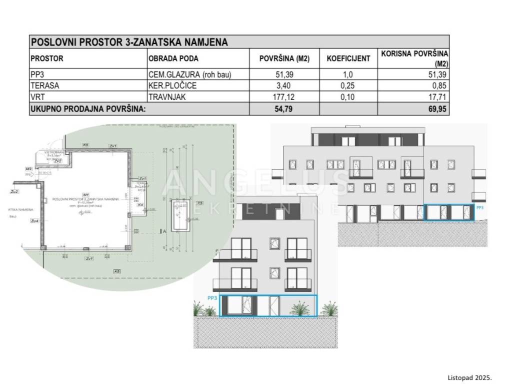 Prodaje se poslovni prostor u novogradnji ukupne neto površine 69.95 m2, zanatske namjene, položen u prizemlju stambene zgrade, orijentacije J-Z. Poslovni prostor predaje se u roh bau stanju što uključuje dovršenu vanjsku ovojnicu, zaglađen betonski pod i dovedenom instalacijom vode, kanalizacije, električne energije i priključcima instalacije slabe struje. Zgrada moderne arhitekture i visoke energetske učinkovitosti gradi se prema suvremenim standardima od vrlo kvalitetnih materijala. Zgrada ima zatvorenu garažu sa parkirnim mjestima, prizemlje i tri kata. Cijena za parkirno mjesto u garaži iznosi 20.000 eur, dok vanjsko parkirno mjesto iznosi 12.000 eur. Kupac ima OBVEZU kupnje jednog vanjskog parkirnog mjesta.