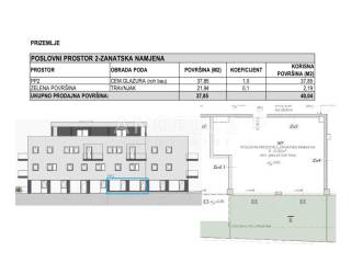 Prodaje se poslovni prostor u novogradnji ukupne neto površine 37.85 m2, zanatske namjene, položen u prizemlju stambene zgrade, južne orijentacije. Poslovni prostor predaje se u roh bau stanju što uključuje dovršenu vanjsku ovojnicu, zaglađen betonski pod i dovedenom instalacijom vode, kanalizacije, električne energije i priključcima instalacije slabe struje. Zgrada moderne arhitekture i visoke energetske učinkovitosti gradi se prema suvremenim standardima od vrlo kvalitetnih materijala. Zgrada ima zatvorenu garažu sa parkirnim mjestima, prizemlje i tri kata. Cijena za parkirno mjesto u garaži iznosi 20.000 eur, dok vanjsko parkirno mjesto iznosi 12.000 eur. Kupac ima OBVEZU kupnje jednog vanjskog parkirnog mjesta.