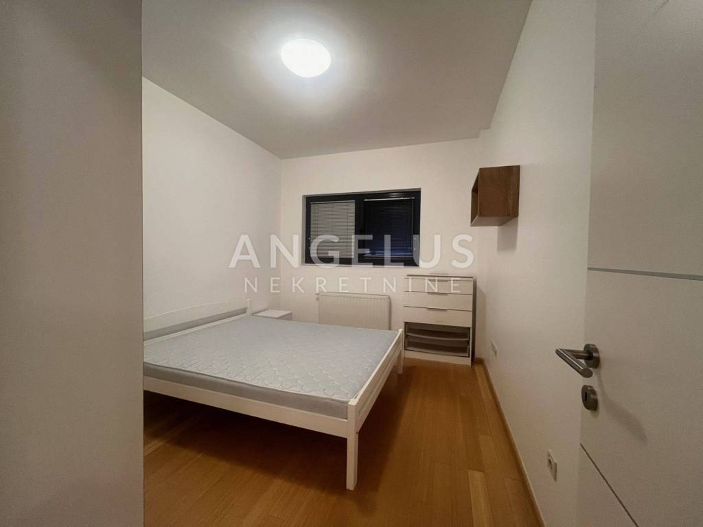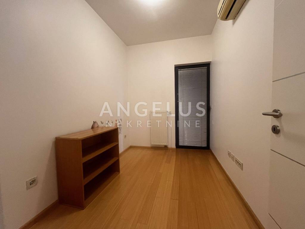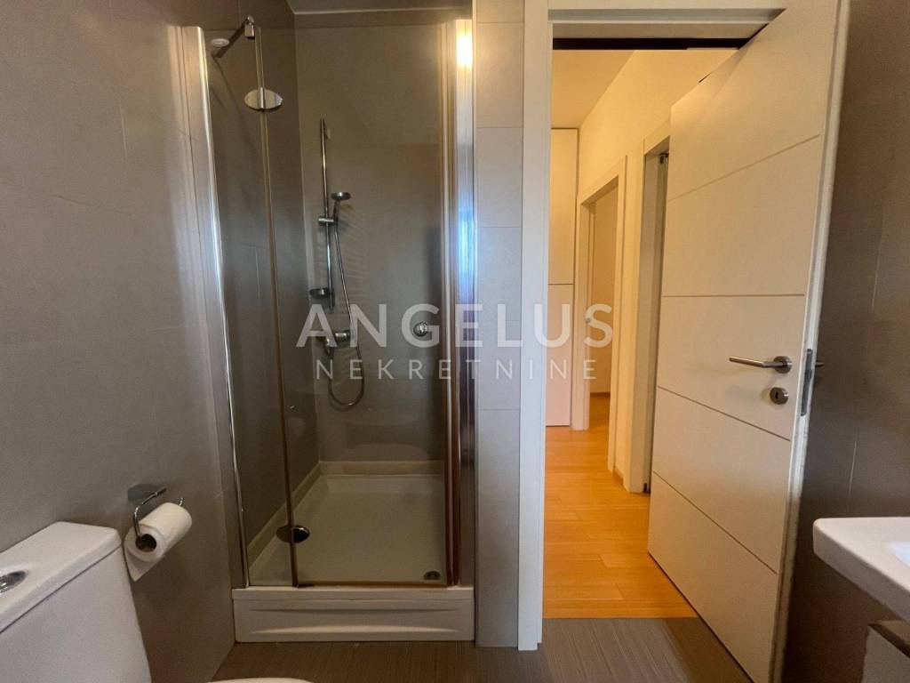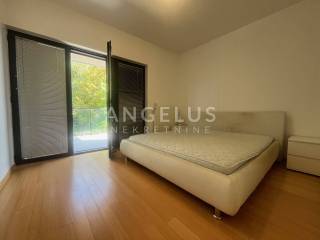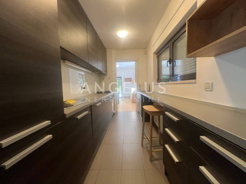 Prva etaža (prizemlje) sastoji se od: ulaznog hodnika, kupaonice, ostave, kuhinje, dnevnog boravka i blagovaonicom i izlazom na terasu i vrt, a druga (1.kat) od: 4 spavaće sobe, balkona i dvije kupaonice. Klimatiziran je, plinsko centralno grijanje. Nenamješten je (osim kuhinje i ugradbenih ormara), namještaj po dogovoru. Pripadaju mu spremište (12 m2) i 2 parkirna mjesta. U vrtu (cca. 200 m2) nalazi se ljetna kuhinja i roštilj.