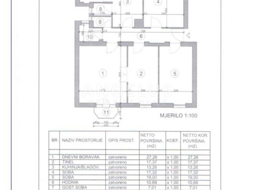 Stan je ukupne stambene površine 120,57 m2 te se sastoji 5 zasebnih velikih soba i 2 pomoćne prostorije, velikog hodnika, toaleta i kupaonice. Stan ima dva balkona. Orijentacija je istok, jug i sjever. Visoki plafoni i veliki prozori čine ga komfornim i sunčanim.