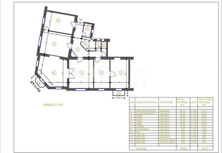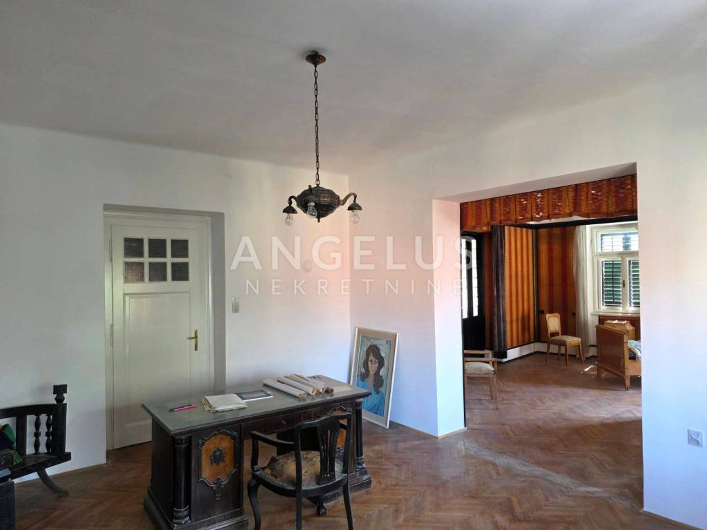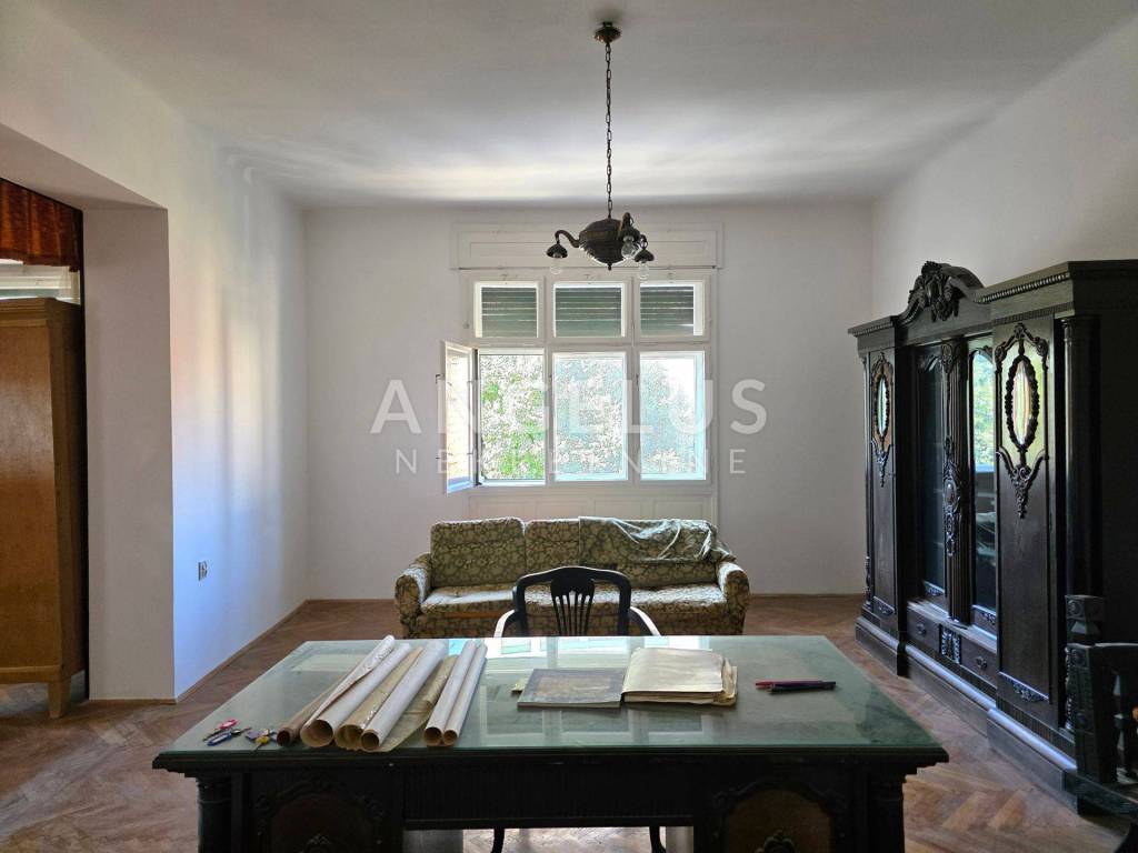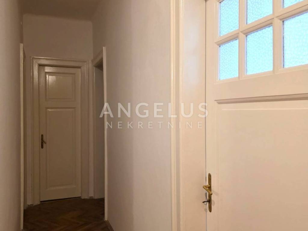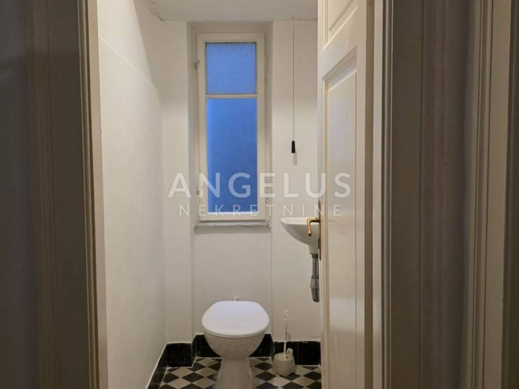 Stan je ukupne stambene površine 165,68 m2 te se sastoji 6 zasebnih velikih soba i 2 pomoćne prostorije, velikog hodnika, toaleta i prostorije koja je pripremljena da bude kupaonica ali po potrebi zakupoprimca može ostati kao dodatan ured. Stan ima dva balkona. Orijentacija je istok, jug i sjever. Visoki plafoni i veliki prozori čine ga komfornim i sunčanim.