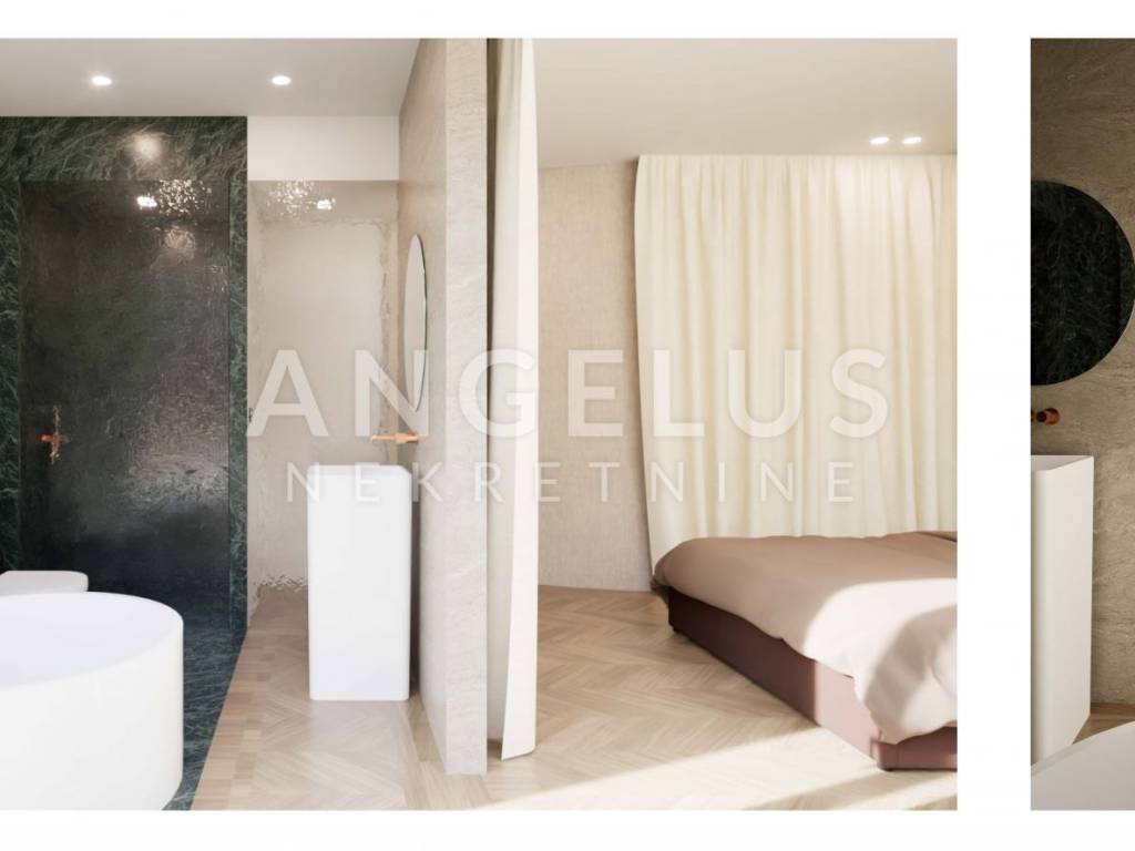 Iznajmljuje se luksuzan stan u modernoj urbanoj vili sa samo 3 stana. Stan se sastoji od: ulaznog prostora sa garderobom, prostranog dnevnog boravka, dvije spavaće sobe s kupaonicama, jedna spavaća soba ima izlaz iz kupaonice tj. saune na terasu gdje se nalazi hladna kupka, predivan pogled na grad i Katedralu sa velike natkrivene terase koja pruža 100% intimu i privatnost (50m2). Na -1 etaži nalaze se 2 parkirna mjesta koja pripadaju stanu i jedno vanjsko parkirno mjesto. Pristup stanu moguć je direktno iz garaže liftom do stana.