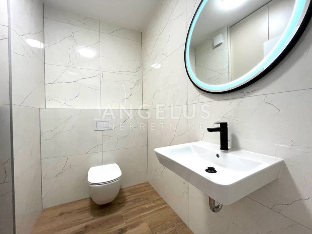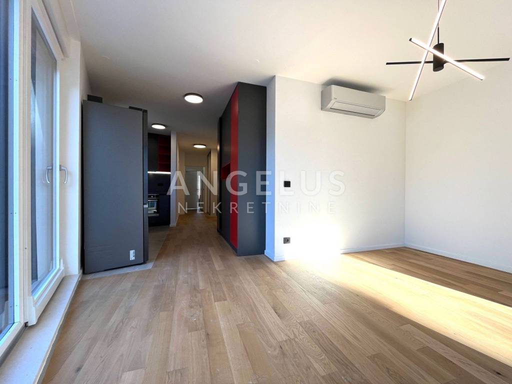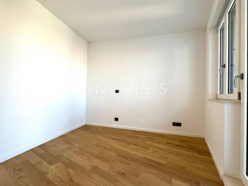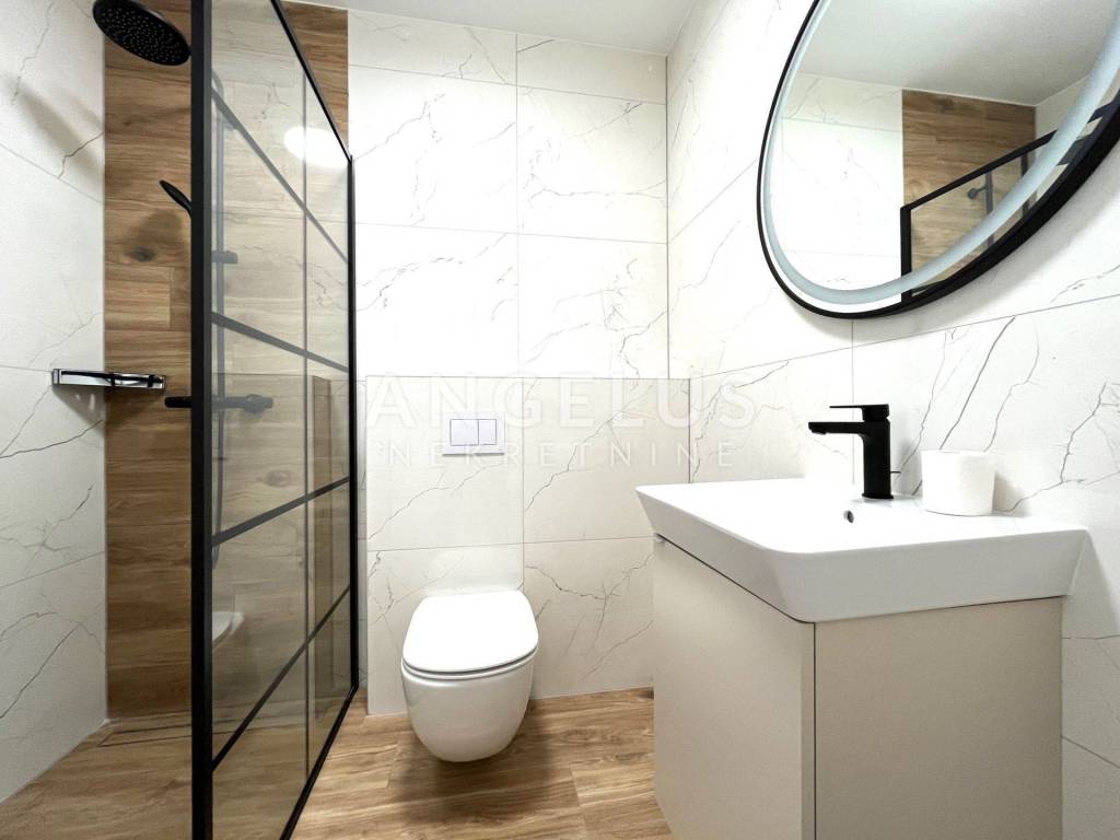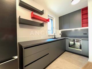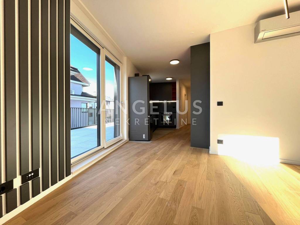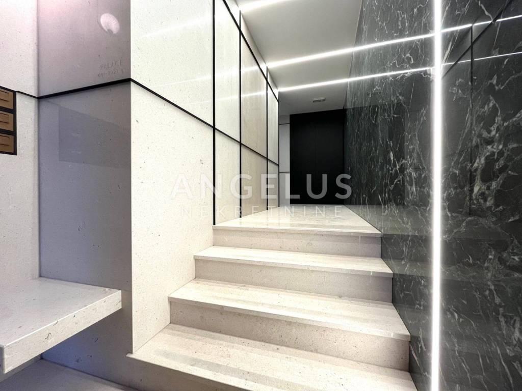 Moderno namješten stan ukupne površine 88 m2 u novogradnji koja je upravo završena, sastoji se od ulaznog hola, kuhinje, blagovaonice i dnevnog boravka kao jedne cijeline s izlazom na lođu i veliku terasu (podne površine cca 40m2), orjentirane na jug i zapad, dvije spvaće sobe različitih površina, jedne kupaonice s walk-in tušem i gostinjskog WC-a.