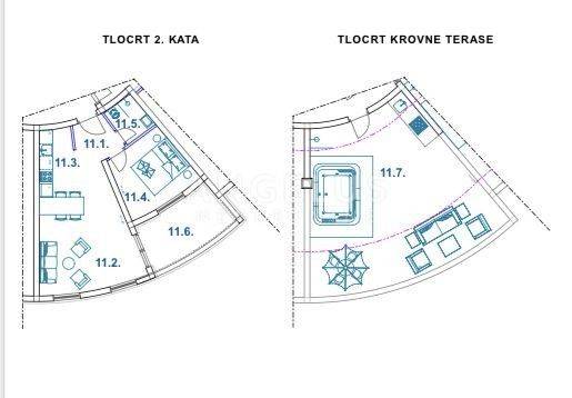 Prodaje se jednosoban apartman ukupne neto korisne površine od 61.64 m2 u novogradnji, položen na drugom katu moderne zgrade koja ukupno broji dvanaest stanova. Stan se sastoji od hodnika, kuhinje i blagovaonice s dnevnim boravkom , spavaće sobe, kupaonice, velike terase s otvorenim pogledom na more. Stanu pripada i velika krovna terasa od 51,53 m2 sa provedenom instalacijom za ljetnu kuhinju i jacuzzi. Stanu su pridružena još dva parkirna mjesta, netto korisne površine 12,00 m2 svaki i dvorišni plato od 9 m2 koji se može prenamijeniti u vanjsko spremište.