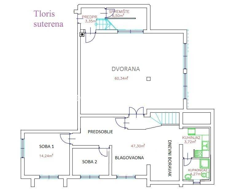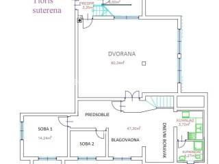 -SUTEREN se sastoji od 3-sobnog stana te velike prostorije (dvorane).