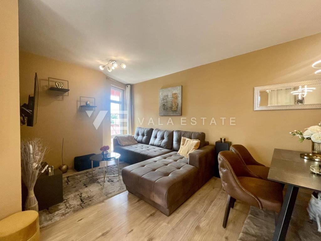 Nekretnine otok Krk, Malinska - na prodaju je komforan namješteni apartman na prvom katu više obiteljske kuće s djelomičnim pogledom na more. Ukupna stambena površina apartmana je 67 m2 a raspoređena je na ulazni prostor, kupaonu, dvije spavaće sobe, dnevni boravak s kuhinjom i blagovaonom i četiri loggie. Pripada mu jedno parkirno mjesto na zajedničkom dvorištu zgrade. Apartman je u potpunosti renoviran, kvalitetne je gradnje i opreme, prodaje se kompletno namješten, klimatiziran je, ima PVC stolariju, podno grijanje u kupaoni, urednu dokumentaciju te je spreman za useljenje. Nalazi se na odličnoj lokaciji, udaljenoj svega 700 m od plaže te samo par minuta hoda od centra mjesta sa svim potrebnim sadržajima. Zbog svoje lokacije odlična je prilika je za vlastito korištenje ili za turistički najam.