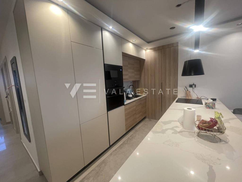 Nekretnine Otok Krk, Njivice - na prodaju je apartman u prizemlju novogradnje koja se sastoji od ukupno četiri stambene jedinice. Apartman obuhvaća stambenu površinu od 91,98 m2 i sastoji se od ulaznog prostora, ostave, dvije spavaće sobe, kupaonice, kuhinje, blagovaone i dnevnog boravka sa izlazom na natkrivenu terasu i uređenu okućnicu na kojoj se nalazi bazen površine 11,32 m2. Pripadaju mu dva parkirna mjesta u garaži i spremište. Za gradnju se koristite kvalitetni materijali i oprema koji uključuju podne obloge od keramike, kvalitetne sanitarije, podno grijanje na toplinsku pumpu, Fan-coil multi split klimatizacija prostorija, video nadzor, ugrađenu visokokvalitetnu ALU stolariju te protuprovalna vrata. Nalazi se na odličnoj lokaciji u blizini mora, lijepih plaža i centra sa svim potrebnim sadržajima. Nekretnina je trenutno u izgradnji, a planirani završetak očekuje se do kraja 2025. godine.