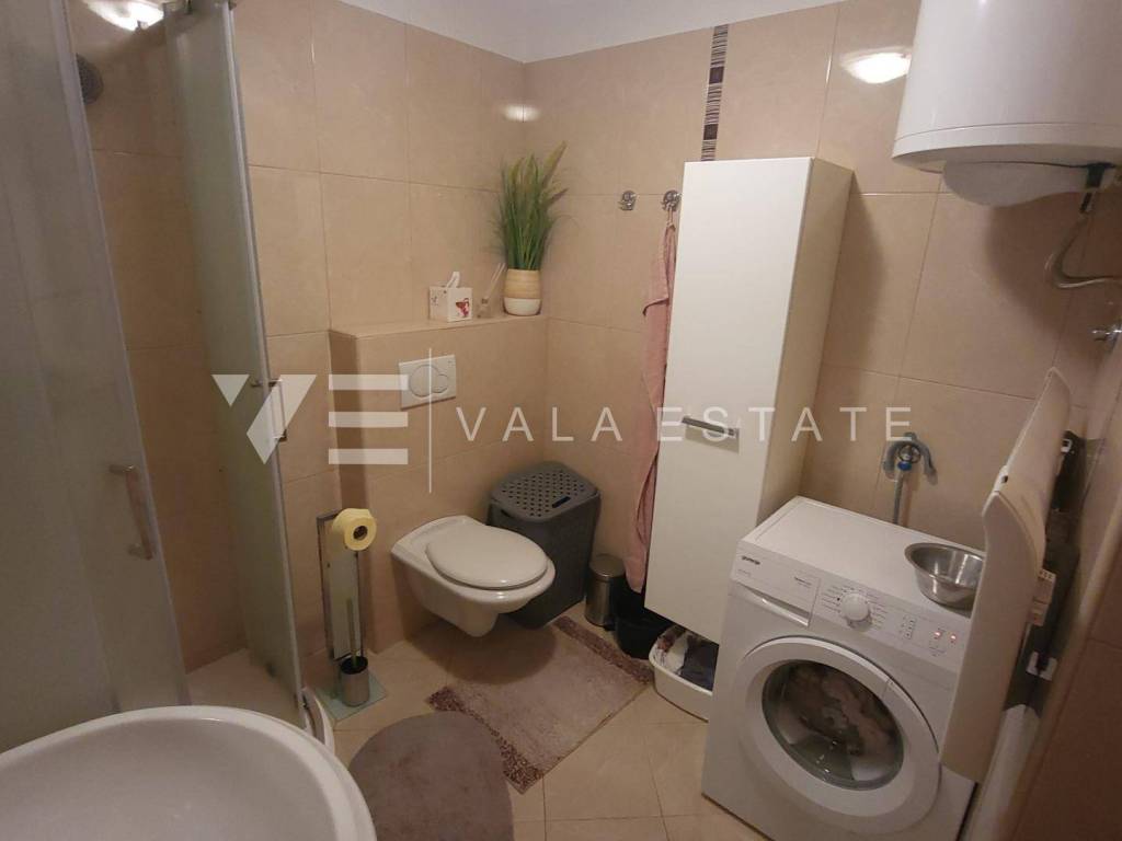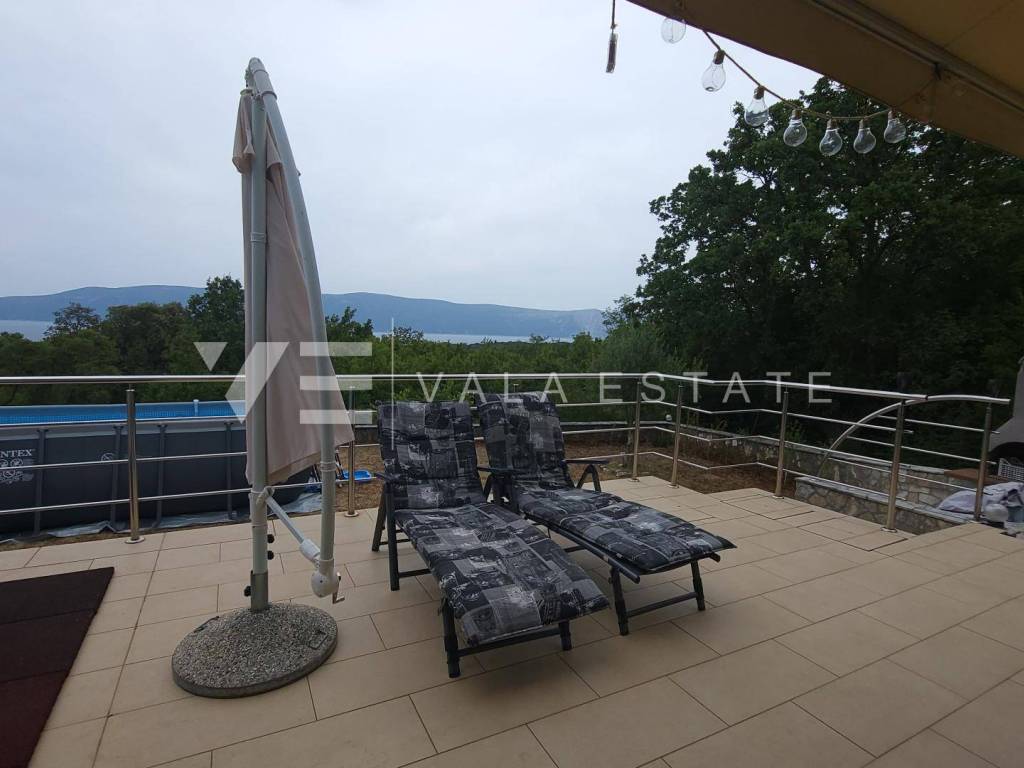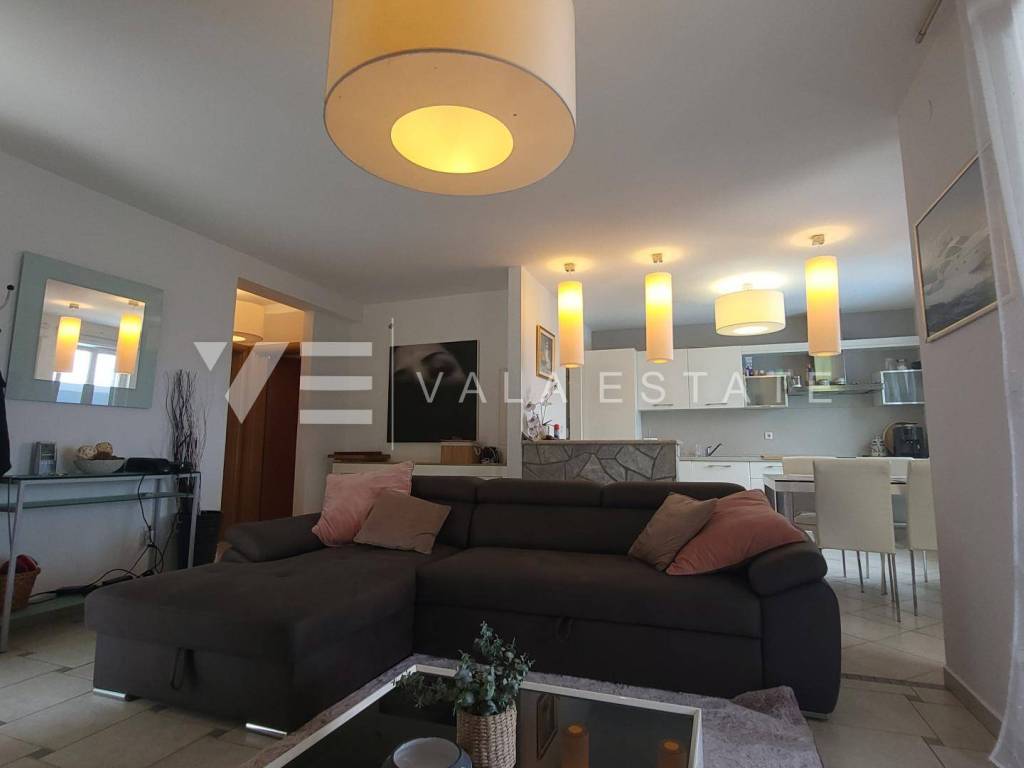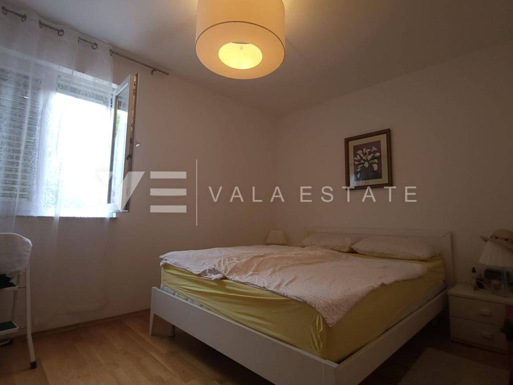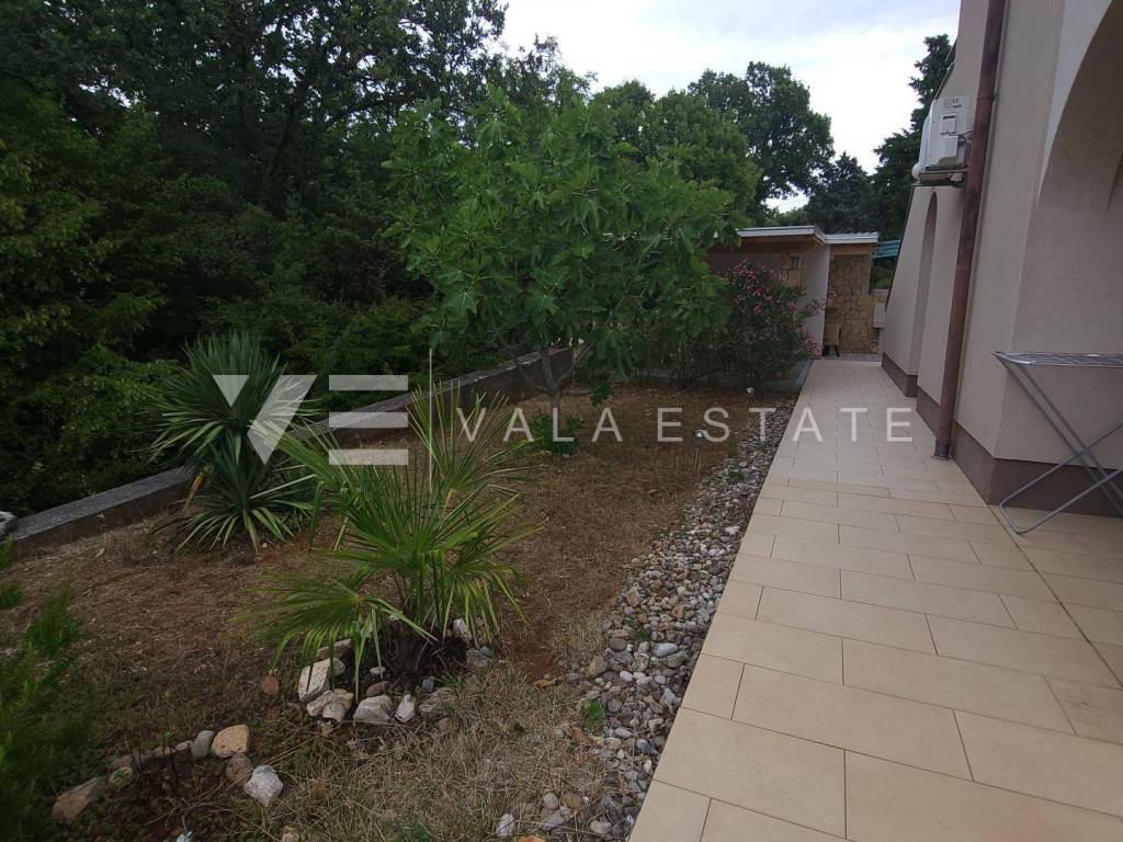 Nekretnine otok Krk, okolica grada Krka - na prodaju je prostrani dvosoban apartman u prizemlju više obiteljske kuće sa ukupno četiri stambene jedinice, smještene u blizini mora i lijepih plaža. Sastoji se od ulaznog hodnika, dvije spavaće sobe, ostave, kupaone i dnevnog boravka sa kuhinjom i blagovaonom sa izlazom na terasu i veliku uređenu okućnicu sa pogledom na more. Apartmanu pripada manja garaža i jedno parkirno mjesto na zajedničkom dvorištu kuće. Prodaje se kompletno namješten i odmah je spreman za useljenje. Kvalitetna gradnja i oprema, uredna dokumentacija, etažno vlasništvo. Nalazi se na mirnoj lokaciji na rubu zelene zone, udaljenoj svega 600 m od prekrasnih plaža.