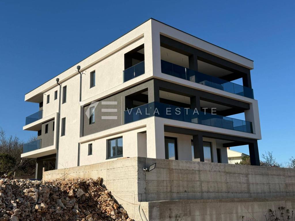 Nekretnine otok Krk, Vrbnik - na vrlo atraktivnoj lokaciji u Vrbniku na prodaju su dva moderna apartmana ukupne površine 155.20 m2 na prvom katu urbane apartmanske ville, sa panoramskim pogledom na more iz svih prostorija. Apartmani se sastoje od stepeništa i lifta s kojim se ulazi direktno iz prizemlja ili podruma. Veći apartan sastoji se od ulaznog hodnika, vešeraja, dvije kupaone, dvije spavaće sobe od kojih jedna ima vlastitu kupaonu i izlaz na loggiu površine 5 m2, prostranog dnevnog boravka sa kuhinjom i blagovaonicom sa izlazom na veliku natkrivenu terasu na kojoj je smješten jacuzzi, a koja stvara dojam lounge zone sa koje se prostire fantastičan pogled na more. Manji apartman obuhvaća ulazni prostor, kupaonu, spavaću sobu i dnevni boravak sa kuhinjom i blagovaonom s izlazom na natkrivenu terasu s pogledom na more. Apartmanima pripadaju dva parkirna mjesta od kojih je jedno natkriveno i dva spremišta u podrumu od 8,18 i 4,98 m2. Kvalitetna gradnja i oprema, izbor vrhunske keramike i podnih obloga, moderne sanitarije, ALU vanjska stolarija, podno grijanje na dizalicu topline, video nadzor i klimatizirani sustav grijanja/hlađenja samo su neka od obilježja ove moderne nove građevine, a ono što je čini posebno atraktivnom je izuzetna lokacija sa otvorenim panoramskim pogledom udaljena samo 700 m od prekrasnih plaža i oko 500 m od centra Vrbnika. Nekretnina je trenutno u izgradnji, a završetak radova i useljenje planira se do ljeta 2026. godine.