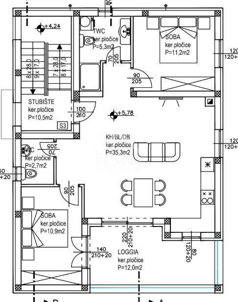 Površine je 74,40m2 i raspolaže sa dnevnim boravkom, kuhinjom, blagovaonom, dvije spavaće sobe, dvije kupaone i natkrivenom terasom.
