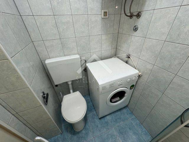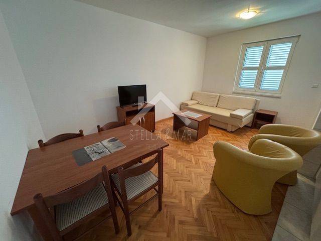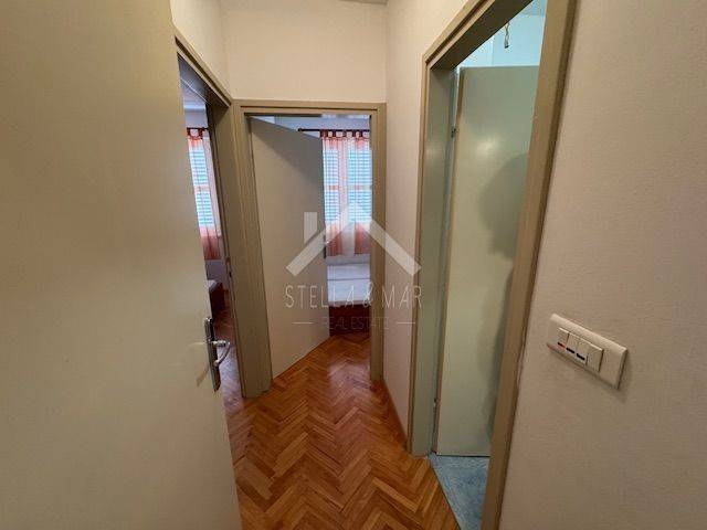 Apartman ima stambenu površinu od 57.69 m2, dvije spavaće sobe, hodnik, dnevni boravak, blagovaonica, kuhinja i wc, te prostrani balkon s kojeg se pruža pogled na more. Apartmanu pripada i ostava, te jedno parkirno mjesto. Zgrada se nalazi na mirnom dijelu naselja, udaljeno od buke. Blizina marketa, tržnice, ribarnice i raznih restorana. Apartman ima klima uređaj, te dimnjak, s mogućnošću postavljanja peći na drva. Nalazi se na prvom katu zgrade, koja ima sveukupno 14 stambenih jedinica. Prekrasna plaža se nalazi uz samu zgradu. Uporabna dozvola, etažirano. Odvojena brojila od struje i vode. Zgrada ima septičku jamu ( bioseparator ).
