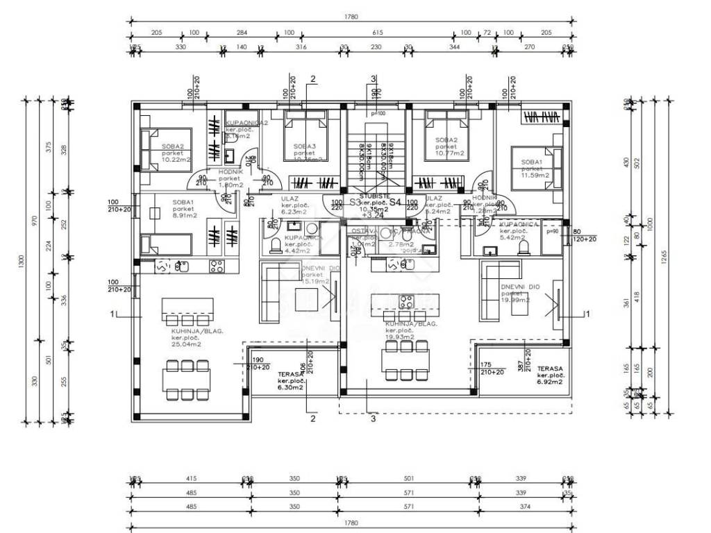 Apartman je površine 86,91m2 i sastoji se od prostranog dnevnog boravka sa kuhinjom i blagovaonom. tri spavaće sobe, 2 kupaone i terase .
