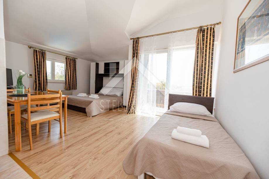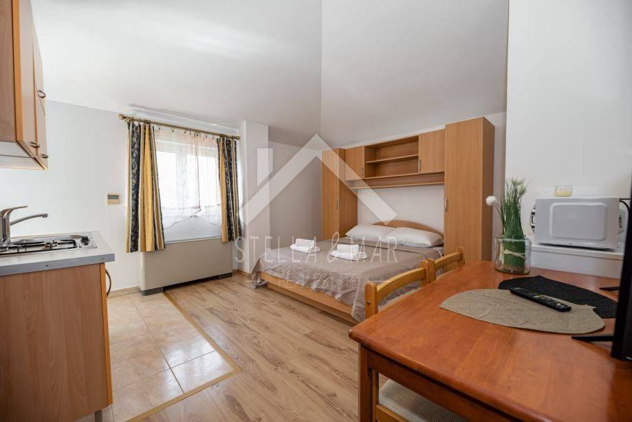 Na prvom katu se nalaze 4 studio apartmana, svaki sa kupaonicom i kuhinjom. Svaki apartman ima balkon.