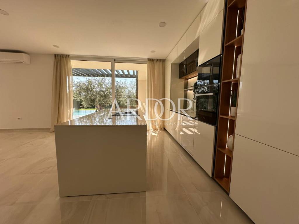 Vanjski prostor upotpunjuje preljevni grijani bazen sa slanom vodom i dizalicom topline, povezan sa smart aplikacijom kojom se temperatura može regulirati na daljinu. Tu je i vanjski tuš lokalnog dizajna, detalj koji naglašava luksuznu notu ove nekretnine. Automatski sustav navodnjavanja osigurava jednostavno održavanje travnjaka tijekom cijele godine.