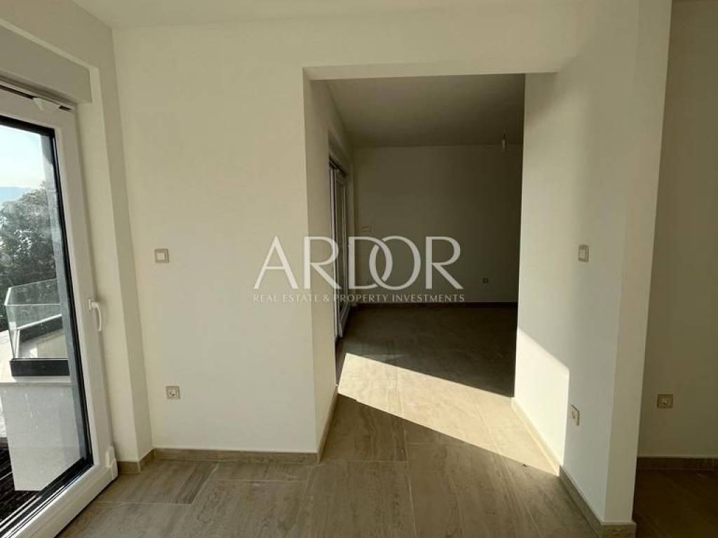 Posredujemo u prodaji prostranog trosobnog stana smještenog na prvom katu, površine 90 m2, smještenog na mirnoj lokaciji. Ovaj elegantan stan sastoji se od prostranog dnevnog boravka s otvorenim konceptom kuhinje, te izlazom na lođu, dvije moderno uređene kupaonice, od kojih jedna pripada spavaćem dijelu, obje opremljene podnim grijanjem i dizalicama topline. Stan ima tri spavaće sobe koje su odijeljene od dnevnog dijela čime je dobiven mir i intima. Iz dnevnog boravka izlazi se na predivnu terasu/lođu od gotovo 9 m2 s izvanrednim pogledom na more, te francuski balkon koji doprinosi svjetlini unutarnjeg prostora.