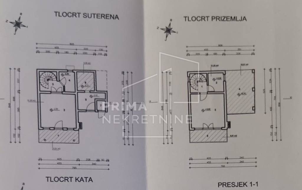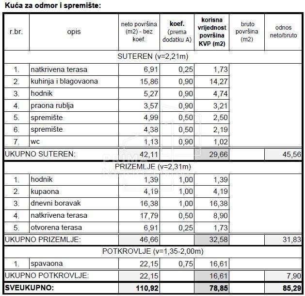 - suterena na kojem se nalazi: hodnik, kuhinja s blagovaonom, wc, spremište, natkrivena terasa