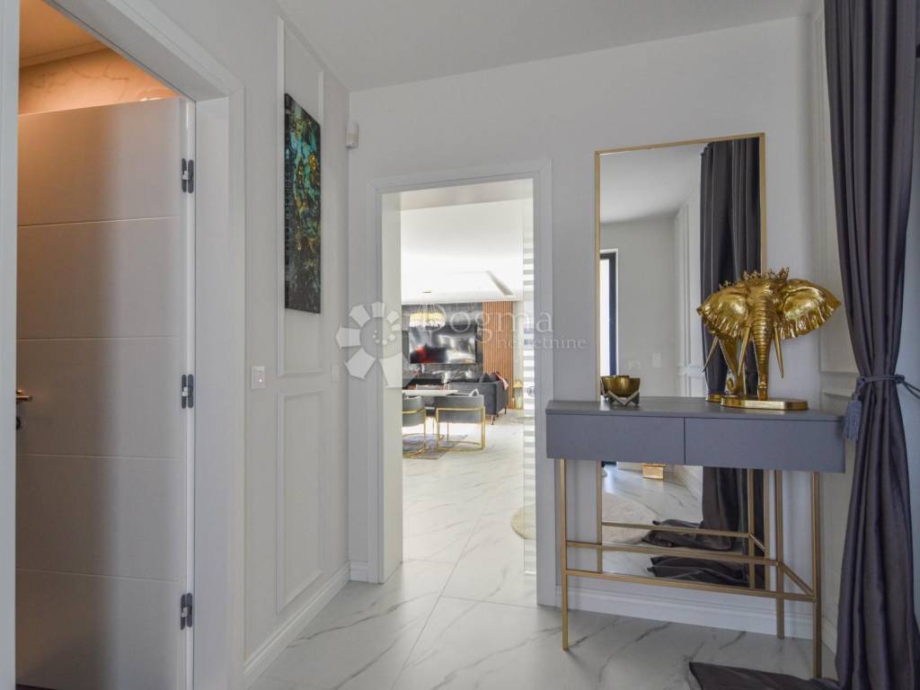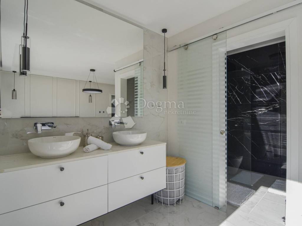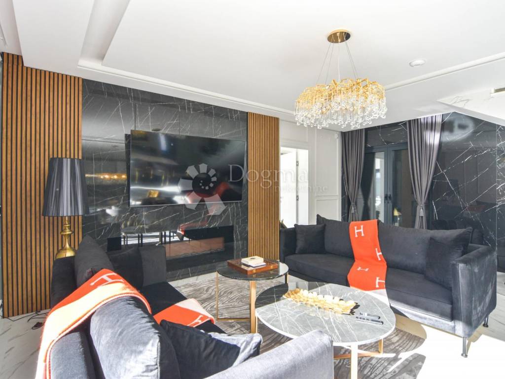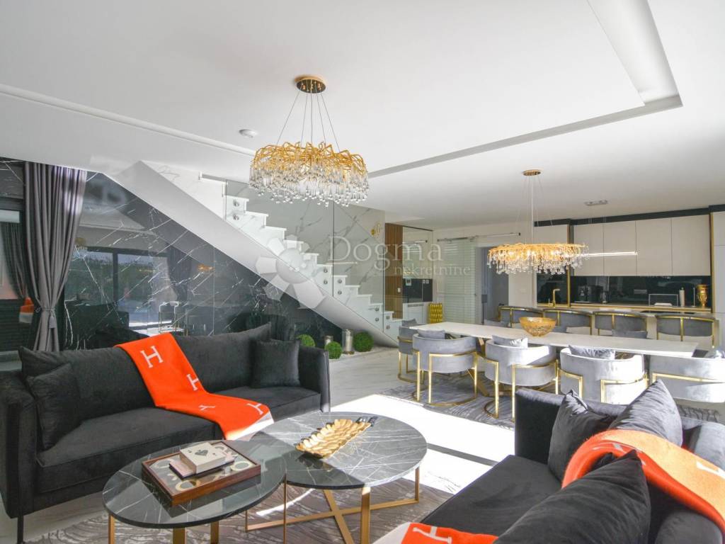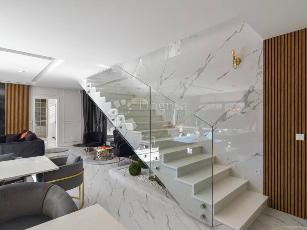 Opremljena je podnim grijanjem putem dizalice topline te fan-coil sustavom za hlađenje, što osigurava maksimalnu udobnost tijekom cijele godine. Cijela nekretnina izgrađena je od najkvalitetnijih materijala i opremljena modernim namještajem, čime se postiže vrhunski luksuzni dojam.