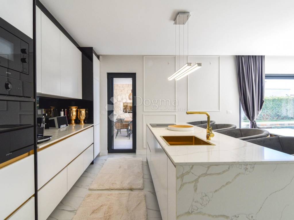 Vanjski prostor prizemlja obogaćen je natkrivenom ljetnom kuhinjom s roštiljem, dodatnom kupaonicom, kotlovnicom i vešerajem. Grijani bazen, okružen sunčalištem i zelenilom, stvara savršeno mjesto za opuštanje i uživanje u mediteranskom ambijentu.