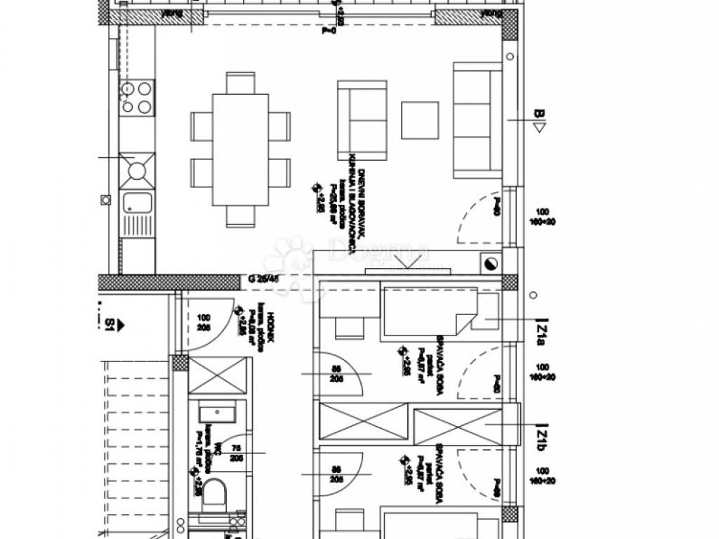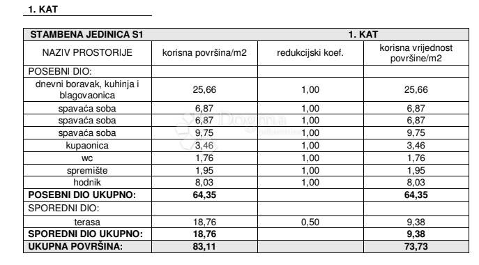 Stan S1 sastoji se od dnevnog boravka, kuhinje i blagovaonice u jedinstvenom otvorenom prostoru, tri spavaće sobe, kupaonice, dodatnog WC-a, hodnika i unutarnjeg spremišta.