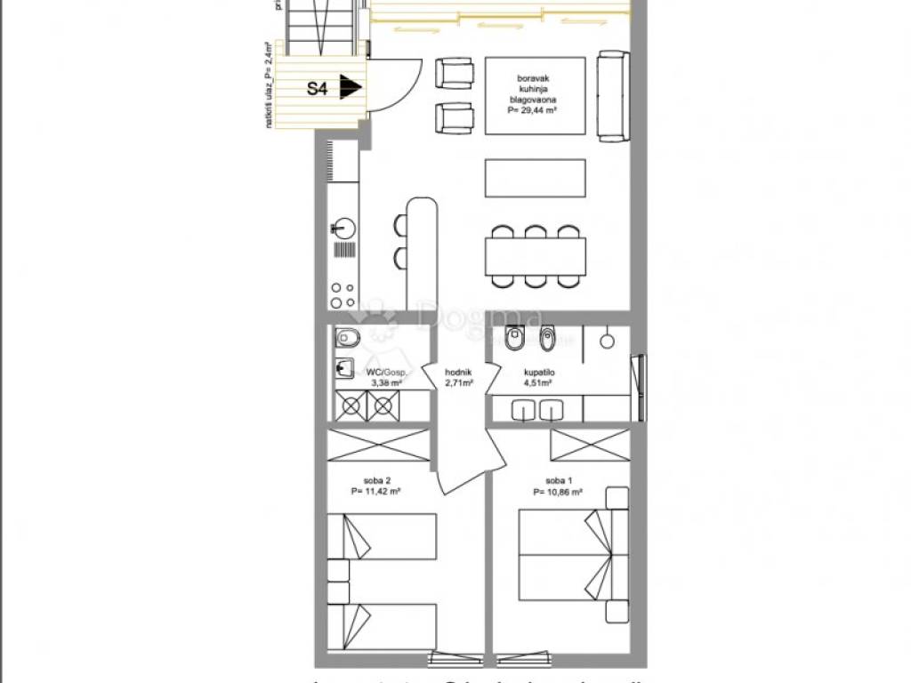 * Dnevni boravak s kuhinjom i blagovaonicom 29,44 m