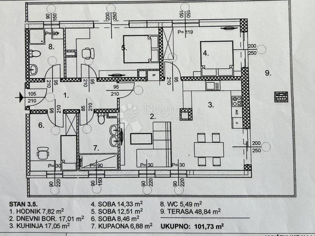 Unutarnji raspored stana osmišljen na način da maksimalno koristi prostor i prirodnu svjetlost. Dnevni boravak povezuje se s modernom kuhinjom otvarajući se prema balkonu i stvarajući ugdan balans prostora. Tri spavaće sobe soba s pogledom na zelenilo donose privatnost i inspiraciju, a kupaonica je uređena elegantnim keramičkim pločicama i opremljena podnim grijanjem. Stan posjeduje dodatno toalet i garderobu. Posebnu vrijednost donosi mu privatna terasa od 48.84 a pripada mu i privatno garažno parkirno mjesto, koje je u cijeni.