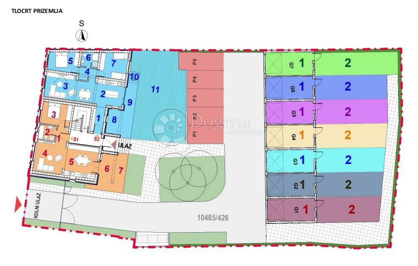 Zgrada će imati ukupno 7 stanova raspoređenih na tri kata. U dvorištu će biti dostupno 5 vanjskih parkirnih mjesta te 7 garaža s vlastitim vrtom, koje se kupuju odvojeno od stana.