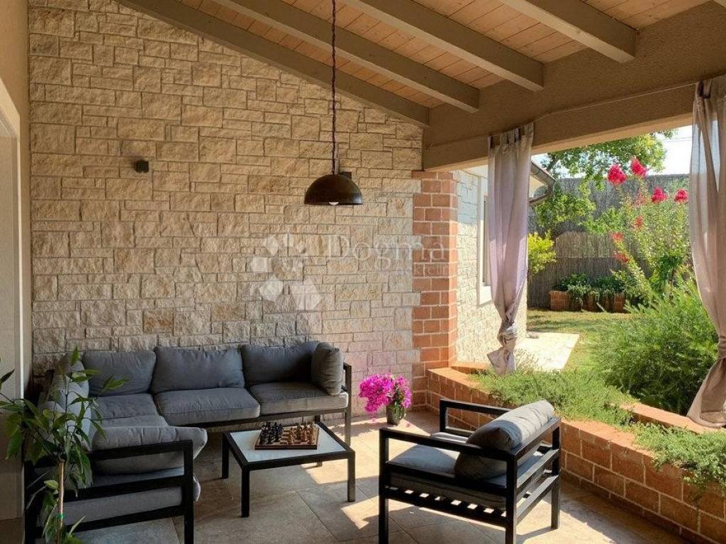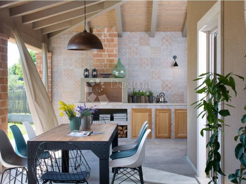 U prijelazu između unutarnjeg i vanjskog prostora smještena je natkrivena terasa s velikim kaminom savršeno mjesto za pripremu jela s roštilja i uživanje na otvorenom. Vila je okružena zelenilom, pružajući osjećaj potpune povezanosti s prirodom i mira.