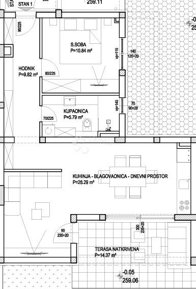 Stan površine 61,93 m nalazi se u prizemlju elegantne novogradnje s ukupno pet stambenih jedinica, što jamči mir i intimu, bez gužve i buke. Prostor je promišljeno organiziran sastoji se od prostrane spavaće sobe, moderno uređene kupaonice i povezane kuhinje s blagovaonicom, čineći funkcionalnu i ugodnu cjelinu za svakodnevni život.