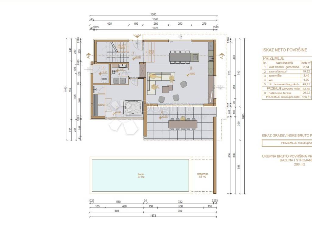 U prizemlju vile nalazi se prostrani ulazni hodnik s garderobom, elegantan wellness prostor sa saunom i jacuzzijem, gostinjski toalet, te otvoreni koncept kuhinje, blagovaonice i dnevnog boravka. Iz dnevnog prostora izlazi se na natkrivenu terasu koja vodi do uređene plaže i bazena površine 37 m.