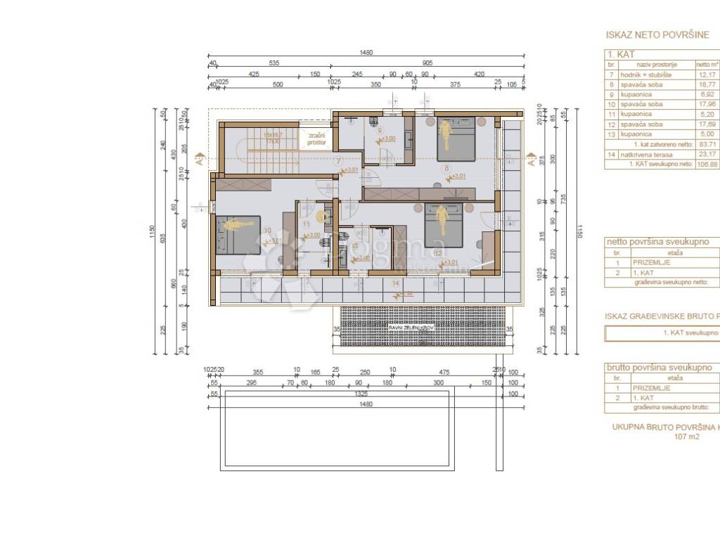 Unutarnje stepenice vode na kat gdje se nalazi noćni dio vile tri prostrane spavaće sobe, svaka s vlastitom kupaonicom, a dvije imaju izlaz na lođu i natkrivenu terasu s pogledom na zelenilo.