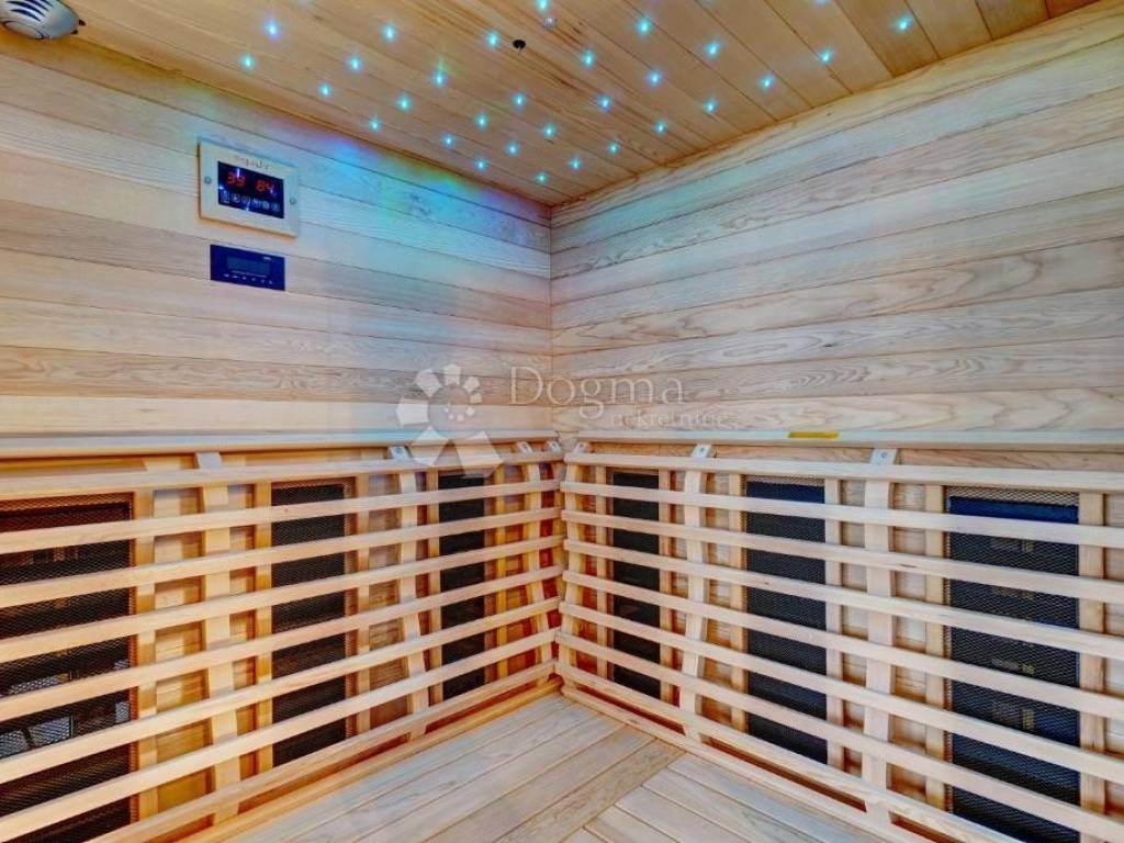 Uz vanjski bazen nalazi se i vanjska kuhinja sa roštiljem. Grijanje vile je kompletno podno sa toplinskom pumpom. Kuća je obložena kamenom kao i zidovi okolo kuće.