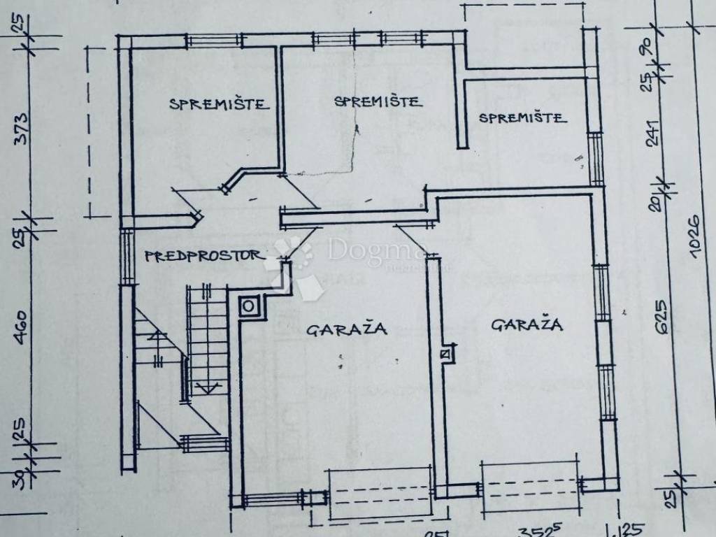 Suteren: 2 garaže, dnevni boravak s kuhinjom, spavaća soba, kupaonica (potrebno renoviranje)