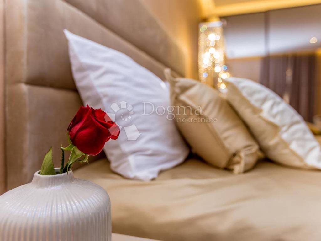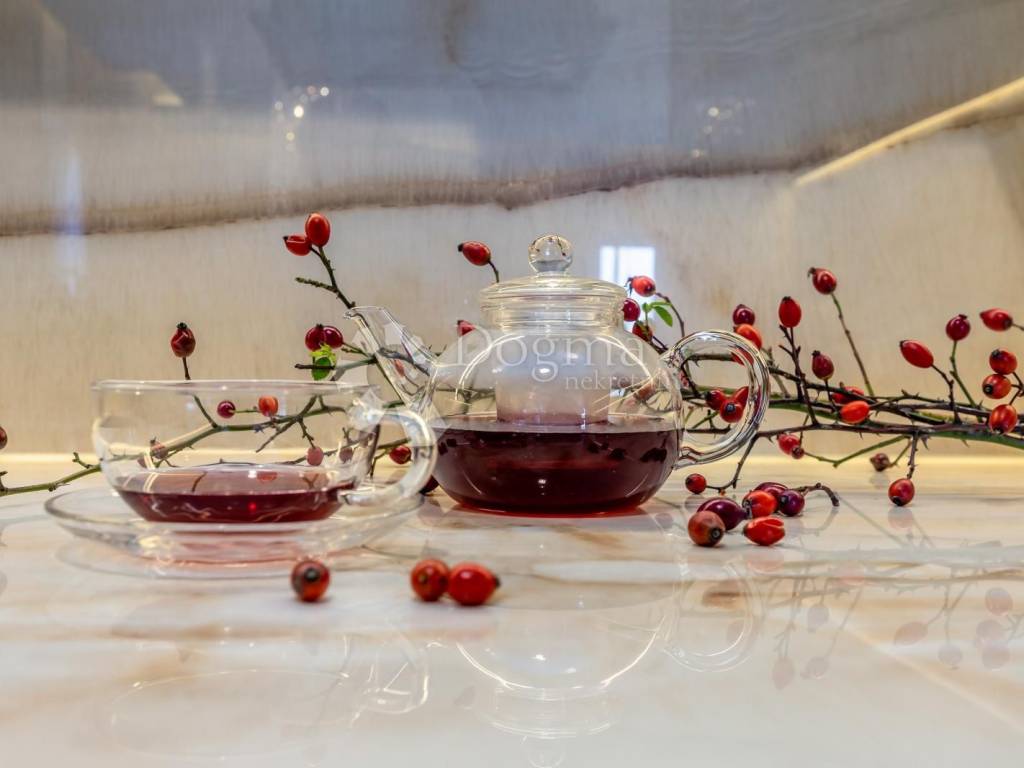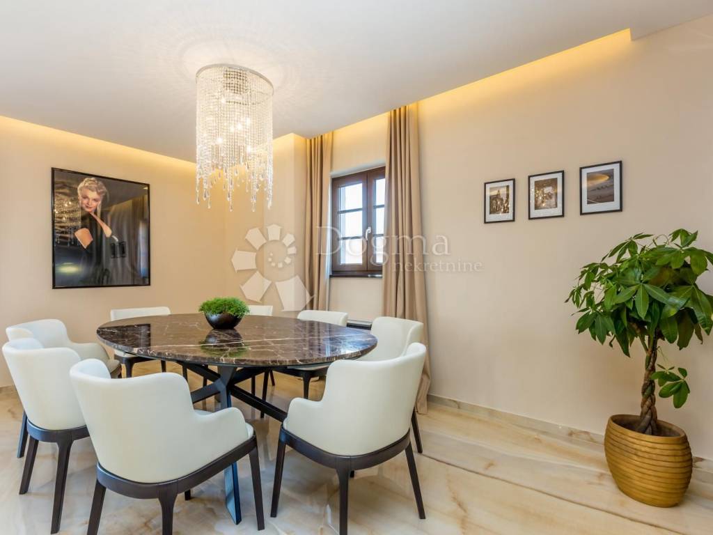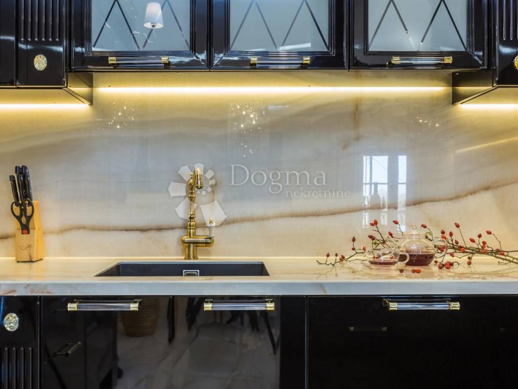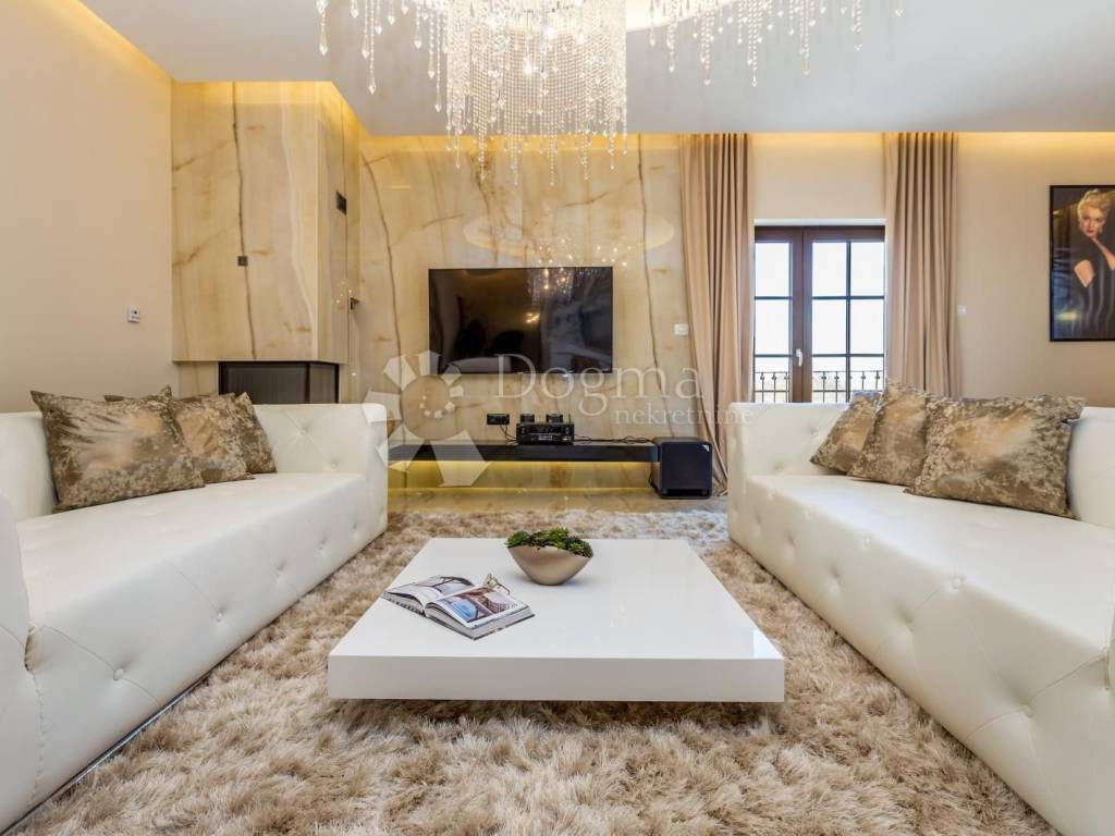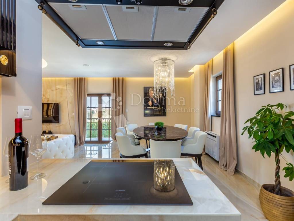 Kameno stubište vodi na prvi kat na kojem se nalazi moderan stan. Vila očarava svojim promišljenim dizajnom. Ništa nije prepušteno slučaju kad je riječ o uređenju interijera, pa se tako kroz cijelu kuću miješaju prirodni tonovi i materijali, stvarajući prozračan ambijent. Od materijala prevladavaju mramorne ploče 3 x 1,5 veličine. Sastoji od open space dnevnog boravka sa kuhinjom, sjajno crne boje koja dominira u svom elegantnom stilu. U dnevnom boravku smješten je i kamin na drva sa ispuhom toplog zraka, a opremljen je i sa podnim Mitsubishi klimama. Dnevni boravak ima jednu lođu i jedan balkon.