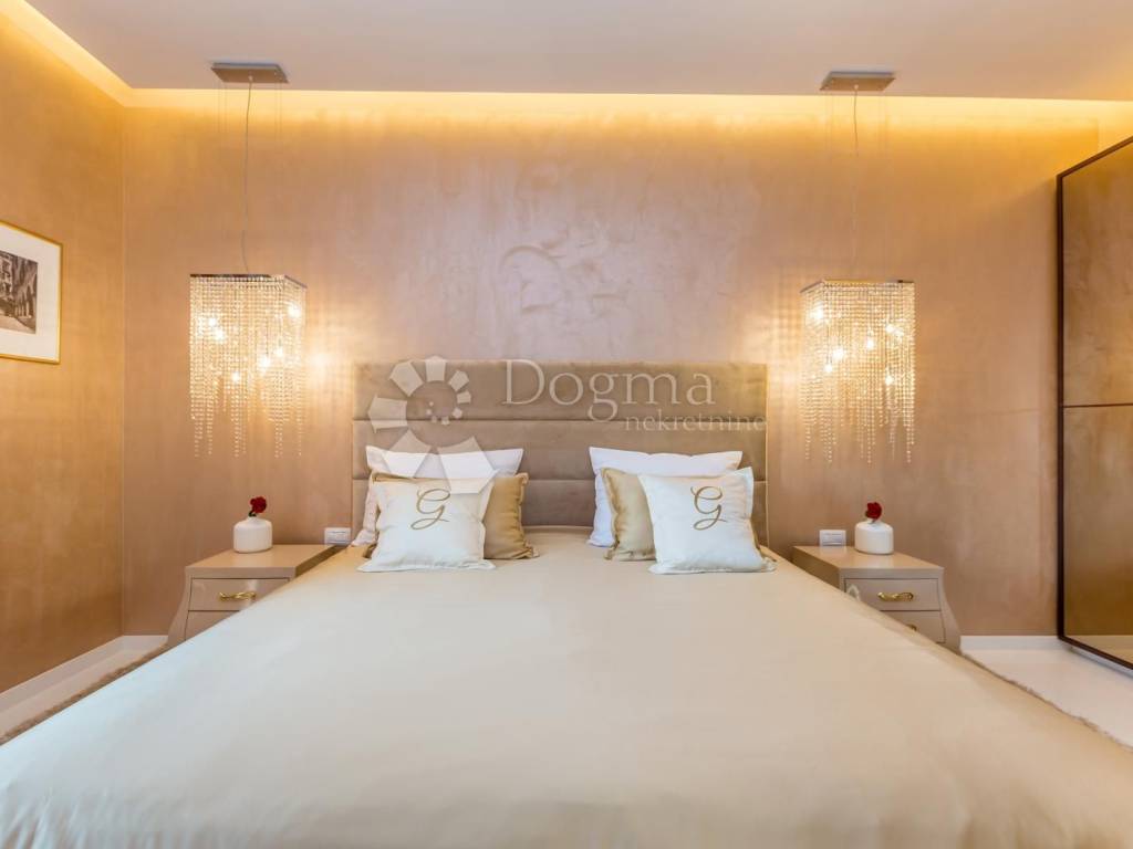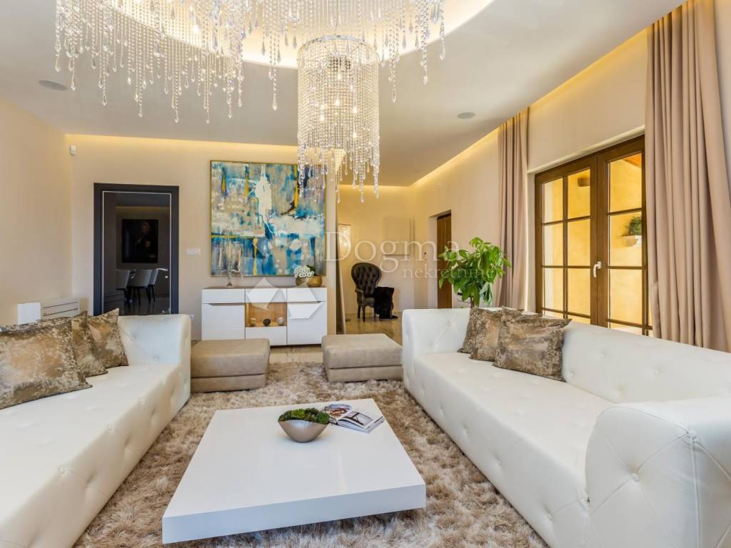 Predivna parcela pravilnog oblika s dvije kaskade, gornja na kojoj je smještena kuća i donja na kojoj se nalazi bazen sa hidromasažnom klupom, lounge zona za opuštanje i sunčanje i travnjak s nekoliko zrelih maslina i palmi što nekretnini daje poseban šarm i privlačnost.