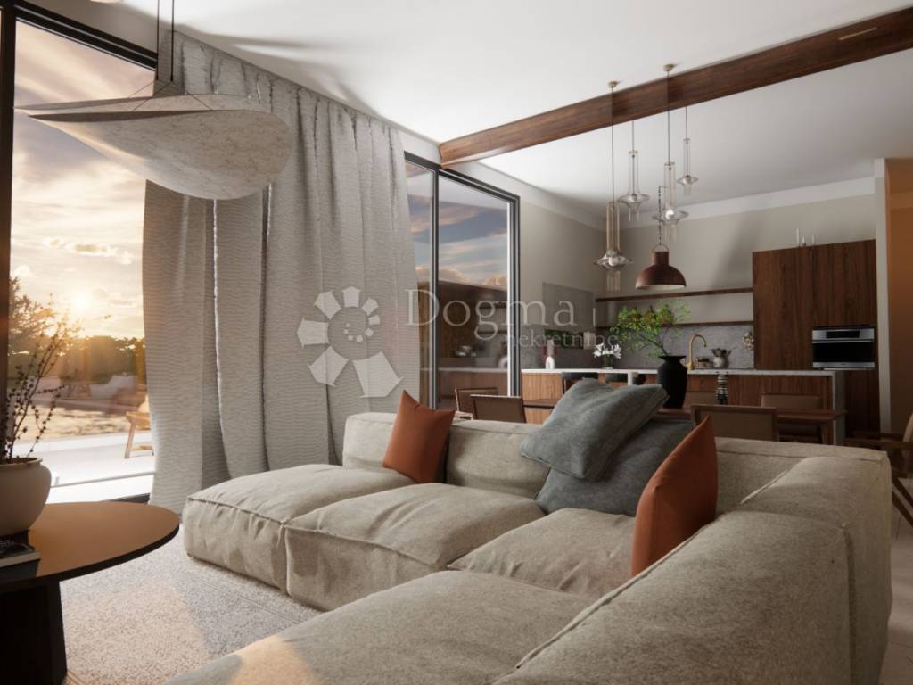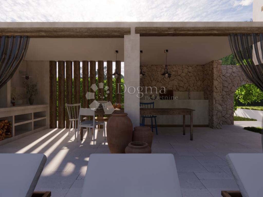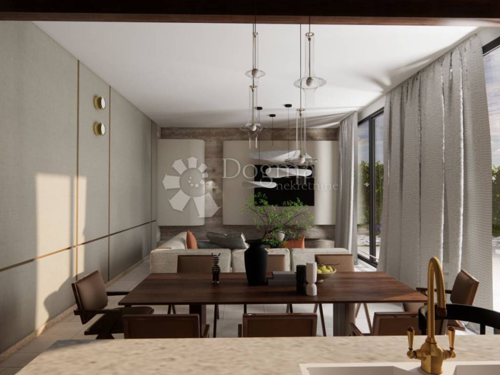 U prizemlju se nalazi prostrani open space dnevni boravak s kuhinjom i blagovaonicom, kupaonica te praktično spremište. Iz dnevnog dijela izlazi se direktno na sunčalište, bazen i natkrivenu terasu savršeno mjesto za uživanje u toplim danima sa prijateljima i obitelji.