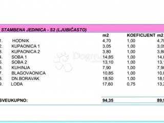 Stan se prostire na površini od 89,95 m i osmišljen je s naglaskom na funkcionalnost i udobnost. Ulaz vodi u hodnik koji se nastavlja u otvoreni prostor kuhinje, blagovaonice i dnevnog boravka. Ovaj prozračni dnevni dio izlazi na lođu s koje se pruža prekrasan i neometan pogled na more savršeno mjesto za opuštanje nakon dana provedenog na plaži.