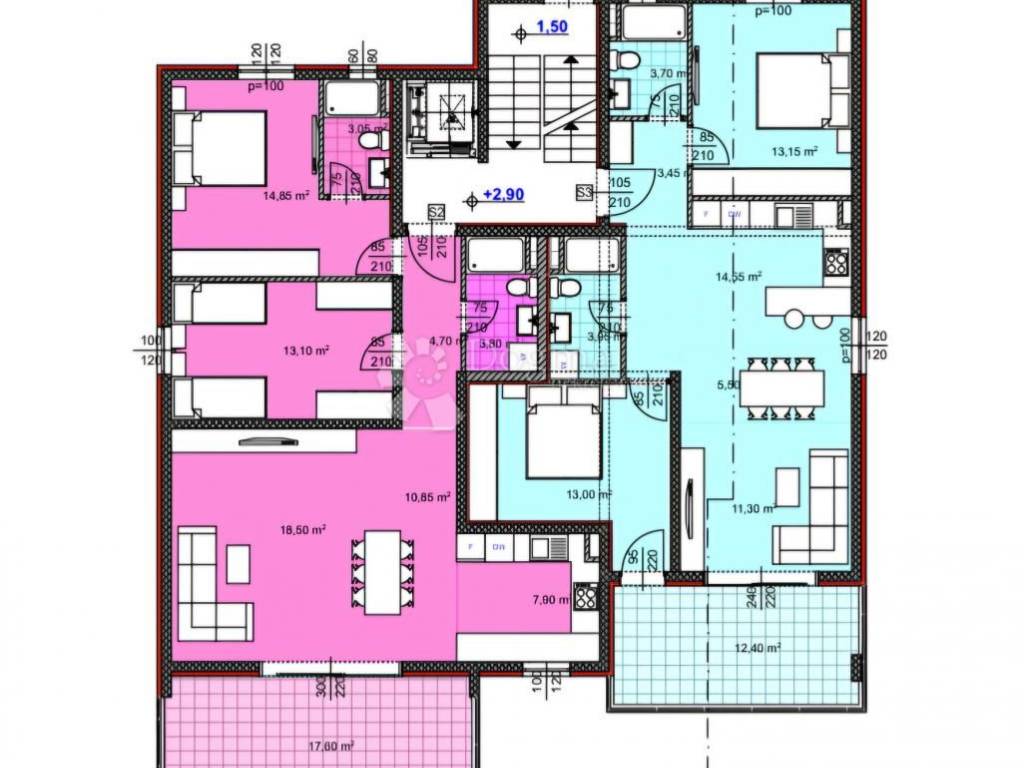 Uz stan dolazi i vlastito parkirno mjesto u garaži, što je velika prednost na ovom području. Na tlocrtu je stan označen ljubičastom bojom.