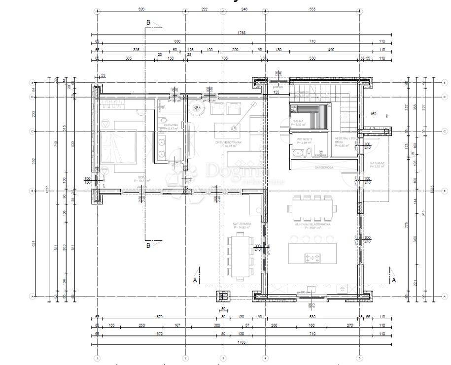 U prizemlju se nalazi prostrani dnevni boravak, kuhinja i blagovaonica, koji su povezani s natkrivenom terasom i bazenom od 36 m. Ovaj prostor je idealan za opuštanje i uživanje u vanjskim sadržajima. U prizemlju se također smješta jedna spavaća soba s vlastitom kupaonicom, kao i sauna koja dodatno doprinosi luksuznom ugođaju. Tu je i dodatni sanitarni čvor za goste, čime je omogućena potpuna udobnost za sve posjetitelje.