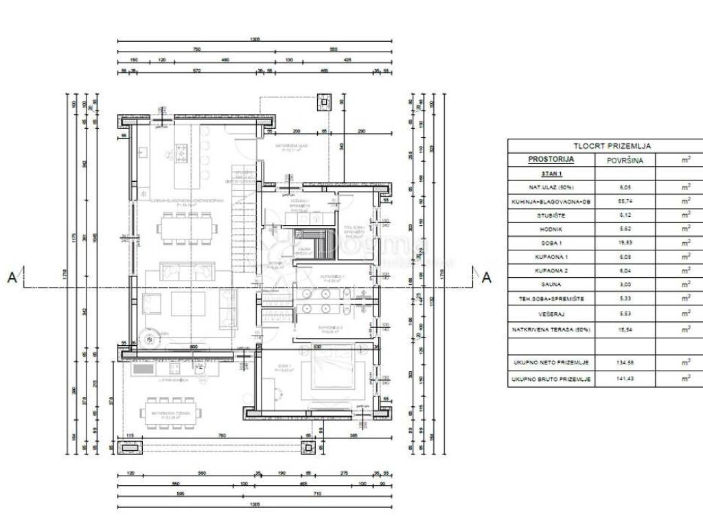 U prizemlju vile nalazi se prostrani dnevni boravak, kuhinja i blagovaonica, sve povezano s natkrivenom terasom koja vodi prema bazenu veličine 36 m. Ovaj prostor je idealan za obiteljska okupljanja i opuštanje na otvorenom. Također, u prizemlju se nalazi jedna soba s vlastitom kupaonicom, kao i sauna te dodatna kupaonica, čime je osigurana potpuna udobnost i privatnost za stanare.