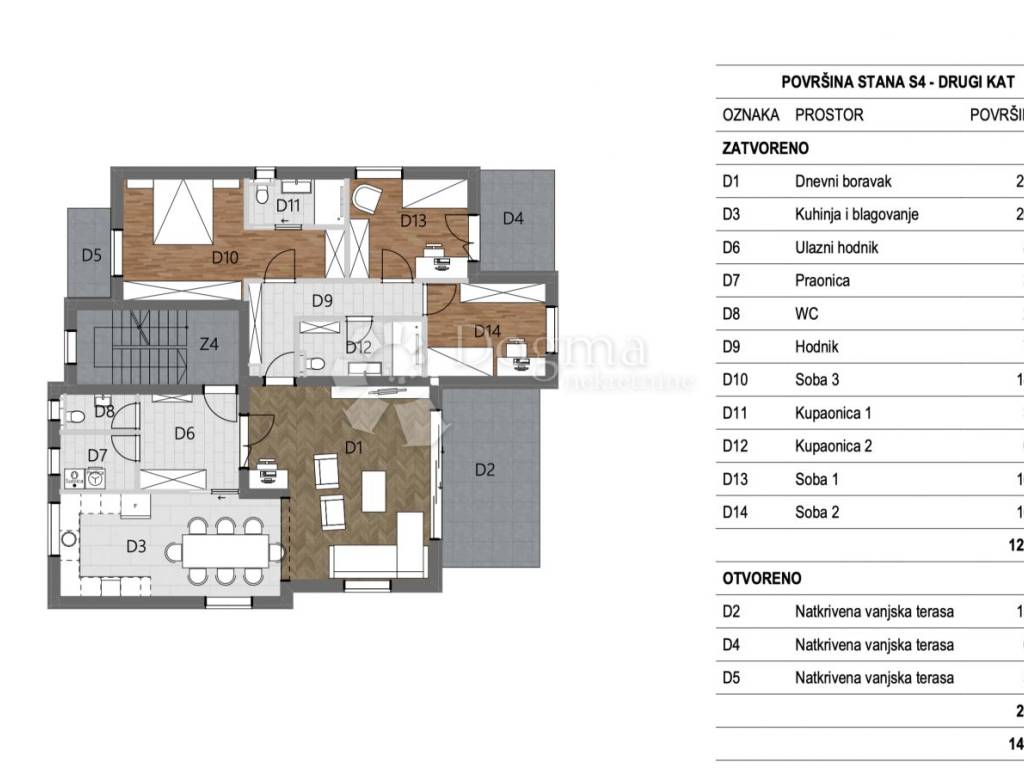 Stan obračunske površine 135,87 m (neto korisne površine 149.01m2) nudi funkcionalan raspored prostorija. Openspace dnevni boravak, zajedno s blagovaonicom i kuhinjom, zauzima 50,45 m, pružajući prostran i svijetao prostor za obiteljska okupljanja, praonica od 3,85 m, spavaća soba 1 ima 10,89 m, spavaća soba 2 od 10,26 m, spavaća soba 3 od 18.11 m i kupaonica 1 od 3,88 m, kupaonica 2 od 6.25 m opremljena je svim potrebnim sadržajem, ulazni hodnik od 8.77 m i WC od 2.31 m.