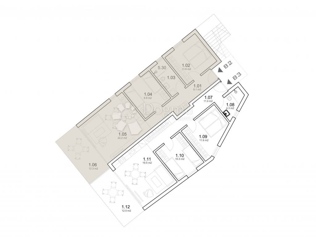 Apartman je neto površine 59,5 m i sastoji se od: ulaza sa hodnikom (9,5 m), WC sa tušem (5,3 m), dvije spavaće sobe (11,6 m i 9,9 m) i dnevnog boravaka sa kuhinjom (23,2 m).
