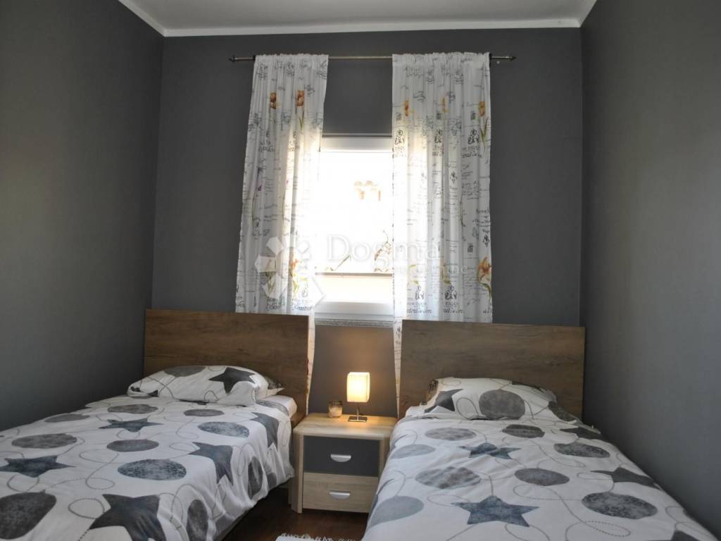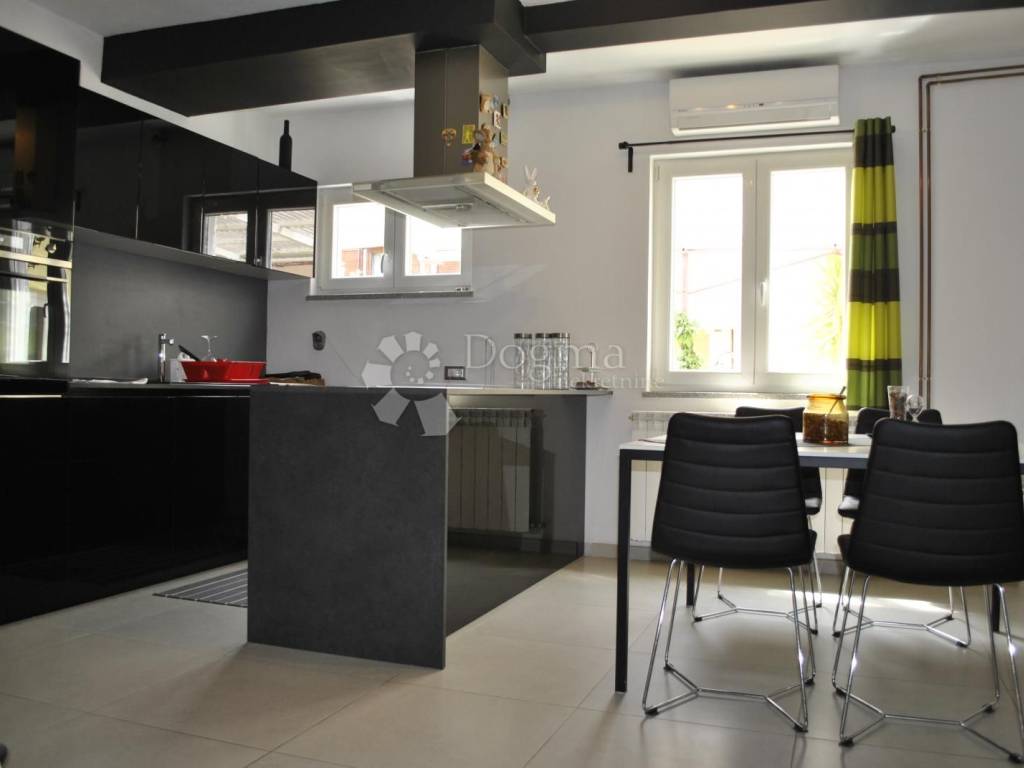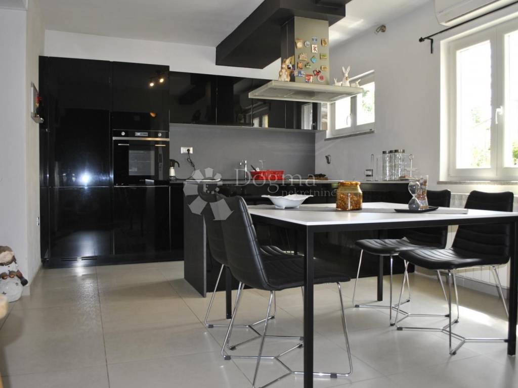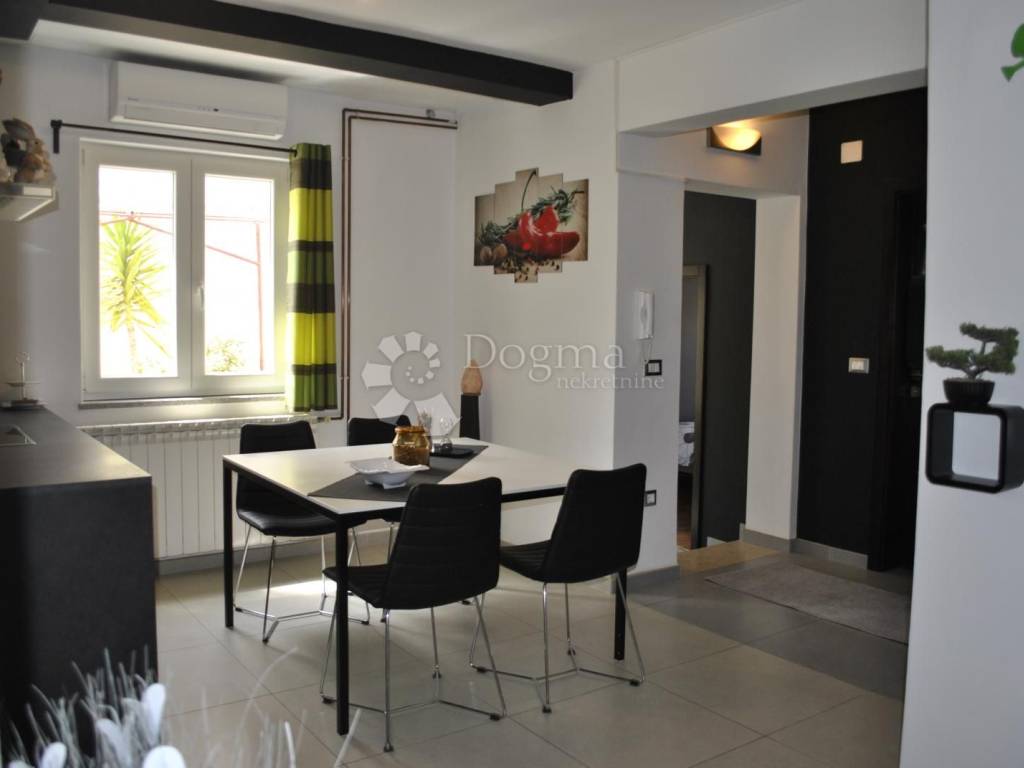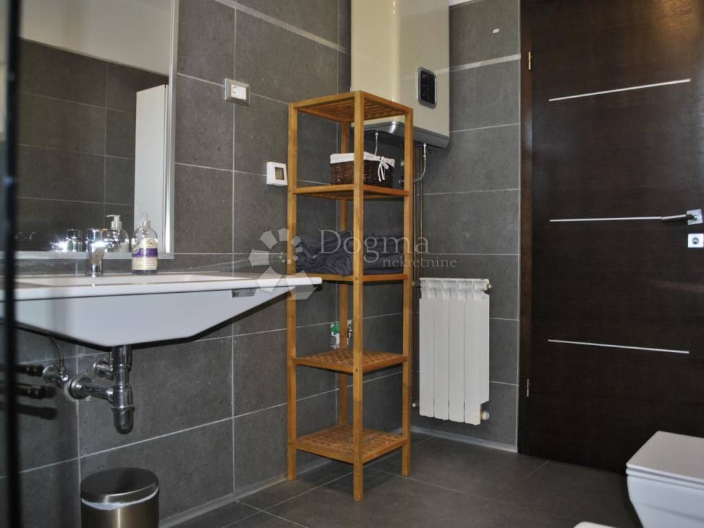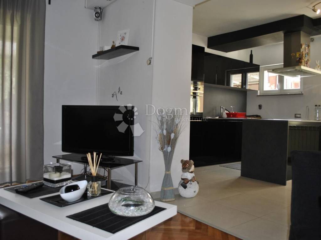 Kuhinja je moderna i potpuno opremljena, s kuhinjskim otokom, a tu je i blagovaonica dovoljno prostrana za obiteljska okupljanja. Hodnik vodi do dvije prostrane spavaće sobe i luksuzne kupaonice s walk-in tušem. Stan je opremljen svim modernim sadržajem klima uređajima, centralnim grijanjem na plin i kvalitetnom PVC stolarijom. Tu je i spremište u podrumu, savršeno za pohranu svih potrebnih stvari.