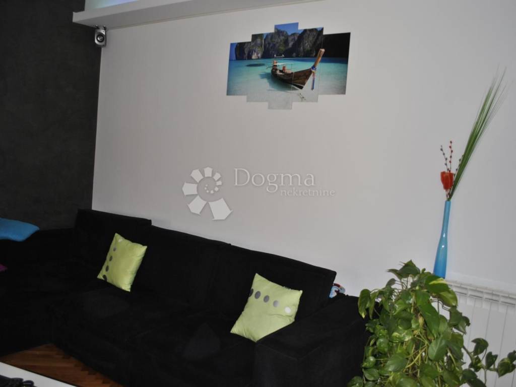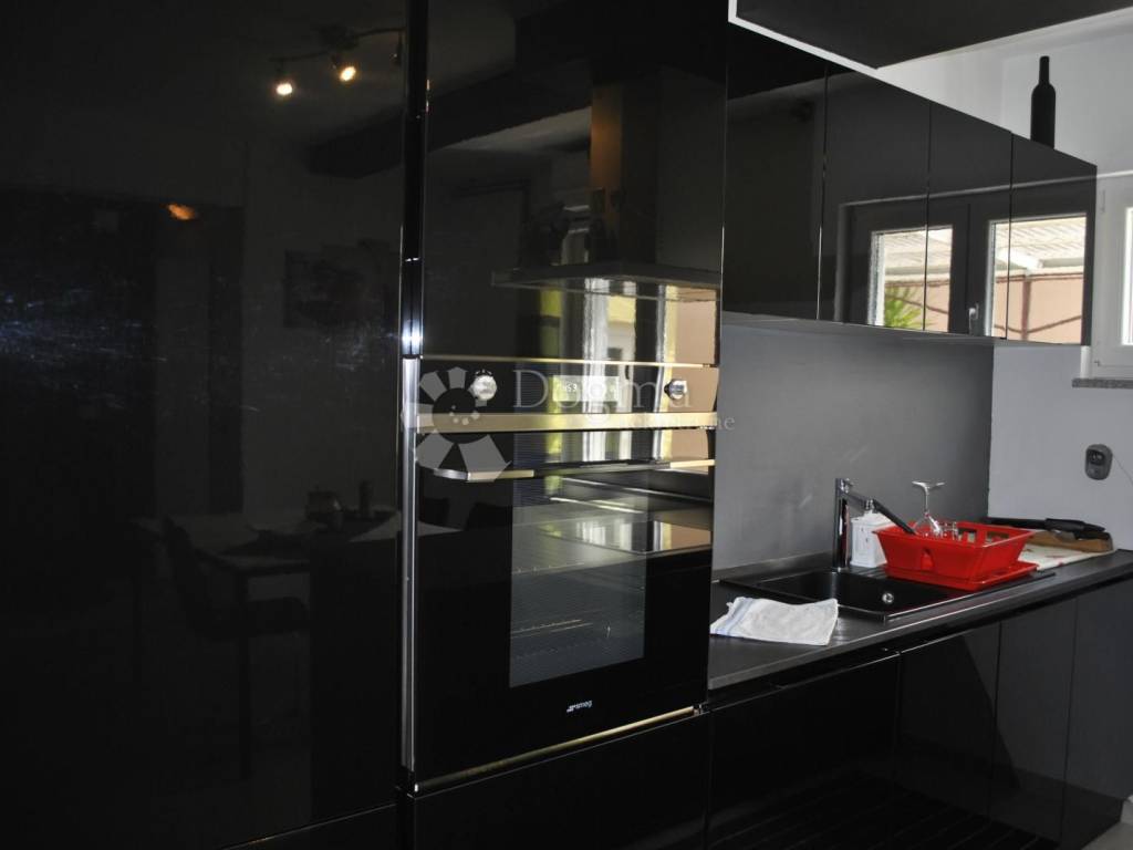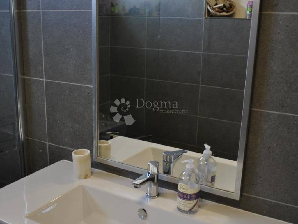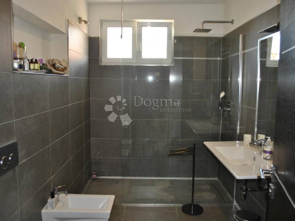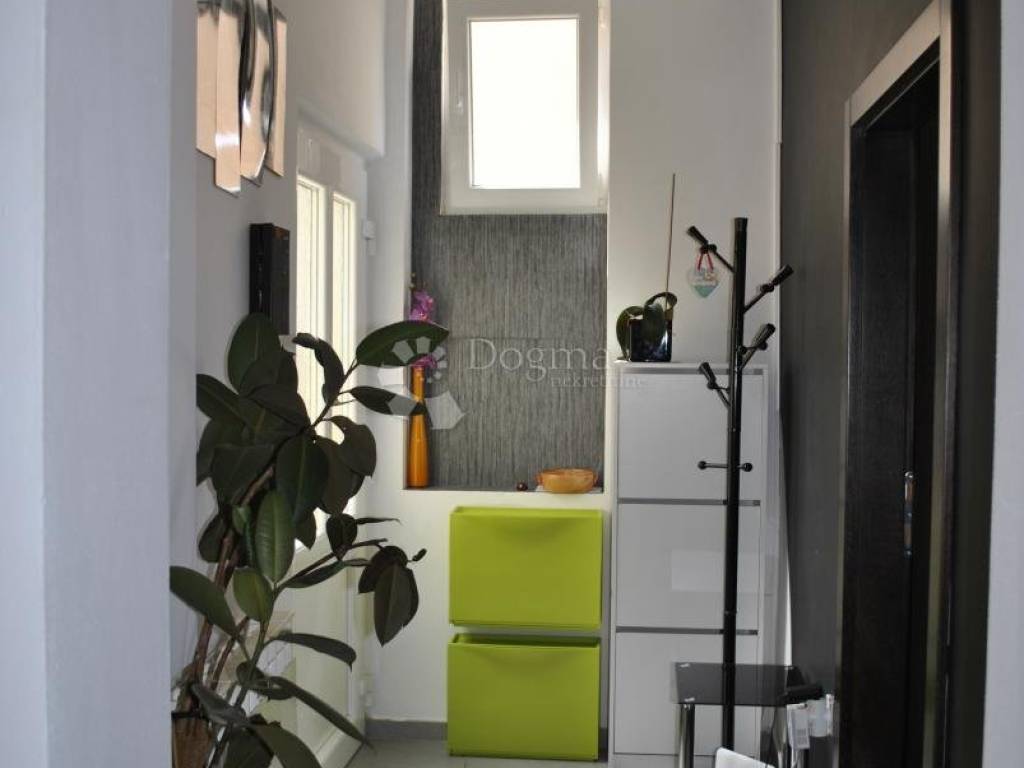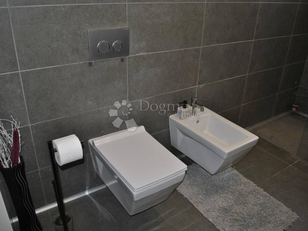 Kuhinja je moderna i potpuno opremljena, s kuhinjskim otokom, a tu je i blagovaonica dovoljno prostrana za obiteljska okupljanja. Hodnik vodi do dvije prostrane spavaće sobe i luksuzne kupaonice s walk-in tušem. Stan je opremljen svim modernim sadržajem klima uređajima, centralnim grijanjem na plin i kvalitetnom PVC stolarijom. Tu je i spremište u podrumu, savršeno za pohranu svih potrebnih stvari.