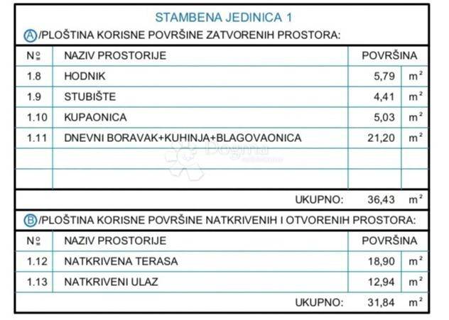 Prizemlje (36,43 m): se sastoji se od: hodnika, kupaonice, kuhinje, blagovaonice i dnevnog boravka koji se nastavljaju na prostranu natkrivenu terasu (31,84 m)