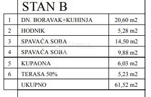 Stan se sastoji se od dnevnog boravka s kuhinjom, koji čine otvoren i svijetao prostor za boravak. Hodnik vodi do spavaće sobe te suvremeno opremljene kupaonice. Iz dnevnog boravka izlazi se na terasu, savršeno mjesto za jutarnju kavu ili opuštanje nakon radnog dana.