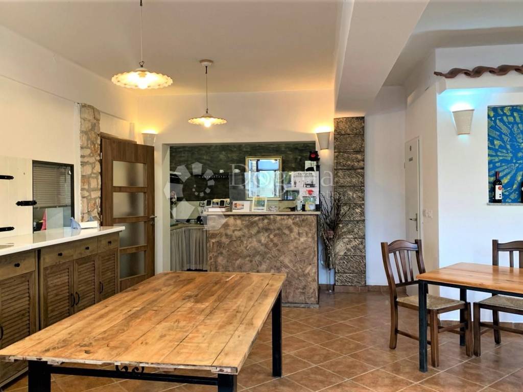 Prizemlje je podijeljeno u tri prostora različite namjene. S prednje strane se nalazi jednostavan ali jako privlačan restoran s kuhinjom, šankom i toaletima za goste i osoblje. U nastavku kuće su dvije sobe s kupaonicama za turiste. Na stražnjoj strani kuće smješten je svijetao stan s jednom spavaćom sobom, dnevnim boravkom, blagovaonicom i kuhinjom otvorenog tipa s izlazom na veliku terasu. Prvi kat je namijenjen smještaju turista i sastoji se iz 6 prostranih soba s kupaonicama jednog apartmana s dvije spavaće sobe, kuhinjom, dnevnim prostorom i kupaonicom.