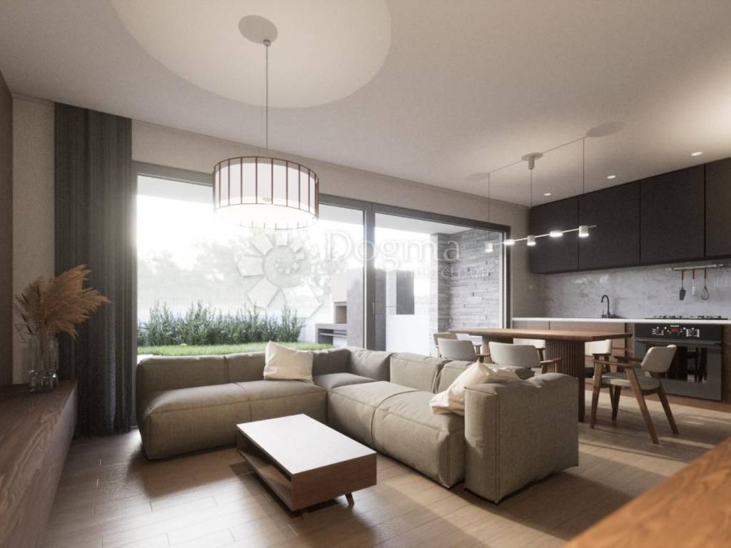 Stan se sastoji od ulaznog hodnika, dvije udobne spavaće sobe, kupaonice s dva velika umivaonika, gostinjskog WC-a, prostranog i svijetlog dnevnog boravka te kuhinje s raskošnom kliznom stijenkom širine 5 metara.