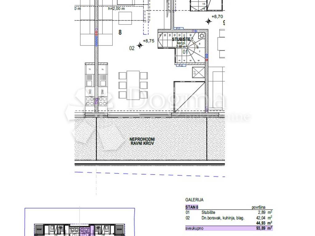 Na prodaju je dvoetažni stan s ukupnom površinom od 93.89m2, smješten na vrhunskoj lokaciji. Ovaj prostrani stan nudi praktičan raspored prostorija na dvije etaže. Prva etaža ovog stana sastoji se od spavaće sobe, kupaonice, radne sobe i praktične garderobe. Posebno je istaknuta terasa površine 16.34m2 koja pruža prostor za opuštanje i uživanje na otvorenom, sa pogledom na more i na okolicu. Druga etaža obuhvaća svijetli dnevni boravak, blagovaonicu i kuhinju. Ova etaža, smještena na vrhu zgrade s prozorima okrenutim na sjeverozapad i na jugoistok pruža ugodan prostor za druženje s obitelji i prijateljima, kao i za svakodnevne aktivnosti.