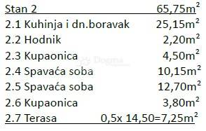 Na prodaju je stan od 63.55 m2. Sastoji se od 2 prostrane spavaće sobe, 2 moderno opremljene kupaonice, dnevnog boravka, kuhinje te prostrane terase površine 7.25 m2 idealne za opuštanje ili druženje na otvorenom.