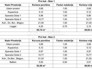 Stan će se nalaziti na 1. katu stambene zgrade. Ukupne površine 49.66 m. Sastoji se od hodnika, 2 spavaće sobe, kupaonice, kuhinje sa blagovaonicom i dnevnim boravkom te loggiom. Stan će biti opremljen keramičkim pločicama i sanitarijama u kupaonici.